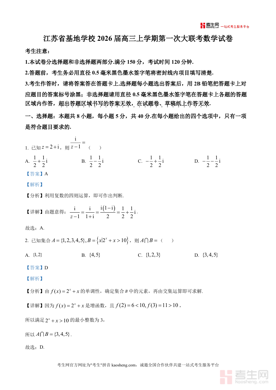 《精品解析:江苏省基地学校2026届高三上学期第一次大联考数学试卷(解析版)》是一份针对江苏省基地学校高三学生定制的高质量备考资料,涵盖全卷选择题(含单选与多选)、填空题、解答题等所有题型,并附带详尽的解析过程。该资料以真题为核心载体,解析部分不仅提供准确答案,还包含题目考点分析、解题思路推导及关键知识点梳理——如复数四则运算、集合交集运算、正态分布对称性应用、函数单调性与极值判断等高频考点均有深入讲解,同时针对立体几何空间关系证明、数列递推关系转化等难点给出分步指导,帮助学生精准把握题型规律与解题方法。其特色在于结合江苏高考数学命题趋势与基地学校联考的命题特点,注重对学生逻辑思维能力与应试技巧的引导,解析内容专业详实,无冗余信息。