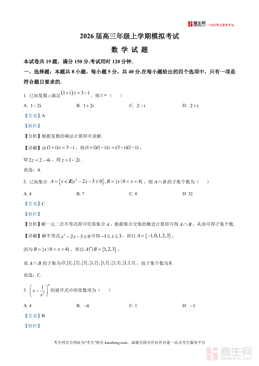 《精品解析:河北省邢台市名校协作体2026届高三上学期模拟考试(一模)数学试题(解析版).docx》是一份针对高三学生数学备考需求设计开发 的高质量真题解析资料。该资料包含完整的模拟考试试题及详细解答过程,覆盖选择题、填空题和解答题三大题型,全面考察学生对高中数学知识点的掌握程度。特色亮点在于每道题目都配有深入分析和解题思路指导,帮助学生理解考点和解题方法,提升应试能力。