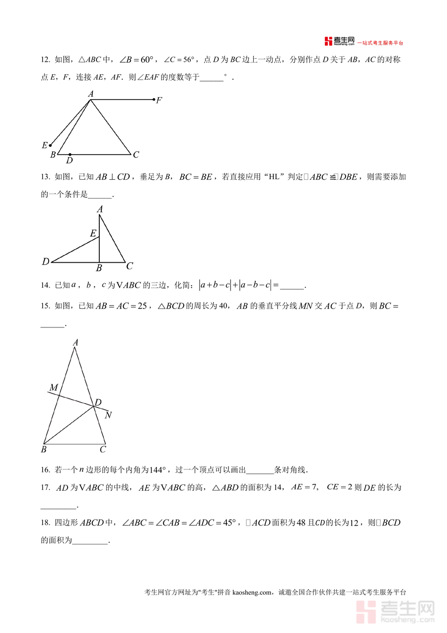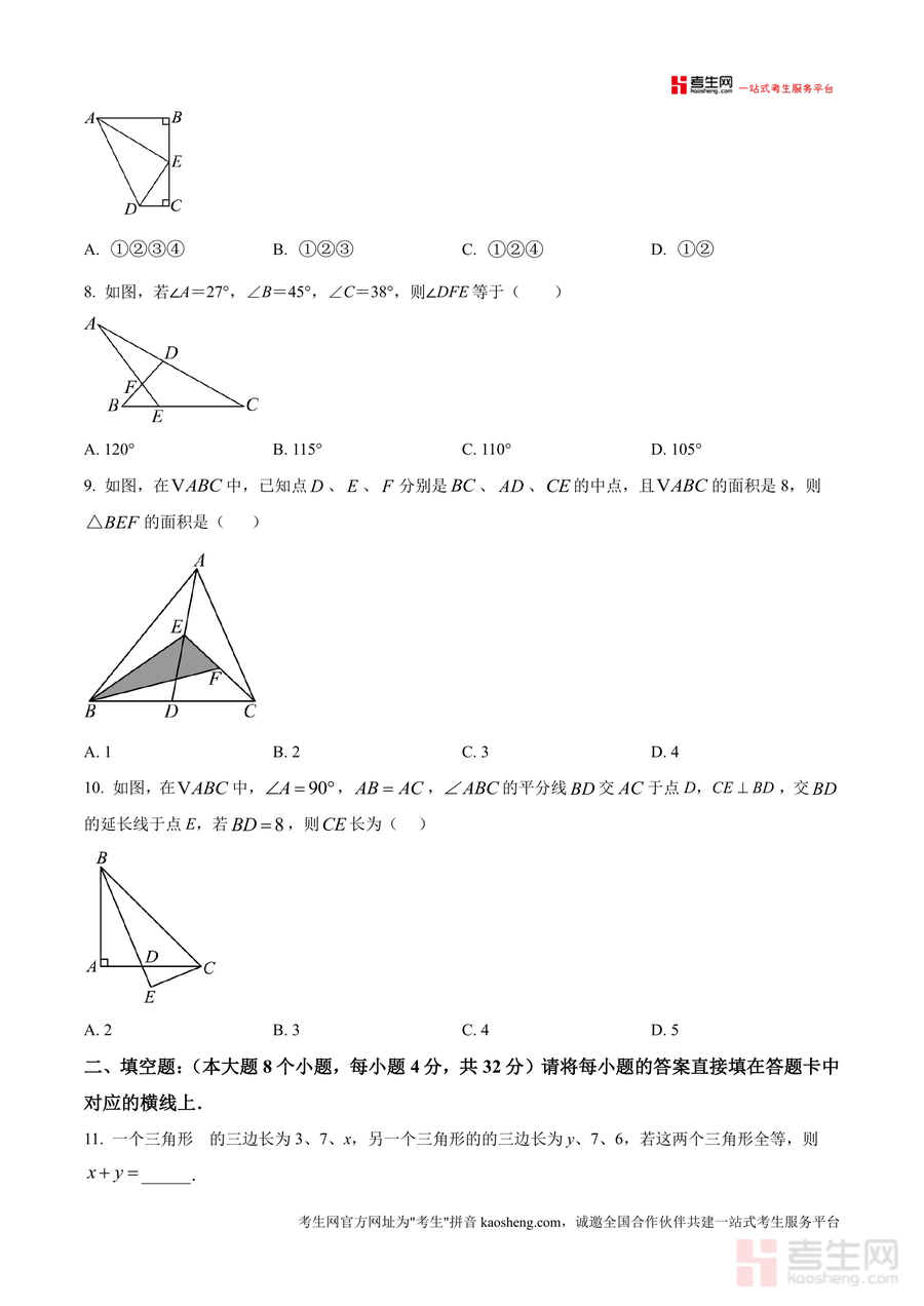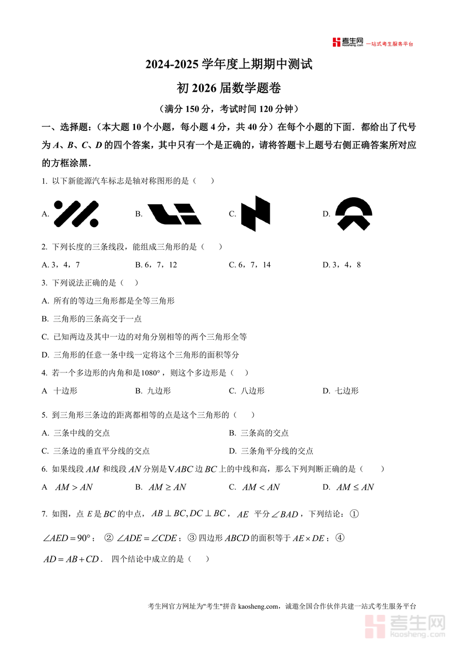 《精品解析:重庆市江津二中联盟十校联考2024-2025学年上学期期中测试八年级数学试题(原卷版)》是一份针对重庆江津地区八年级数学期中联考设计的真题原卷资料,聚焦八年级上册数学核心知识点,包含选择题(10小题共40分)、填空题(8小题共32分)及解答题(8小题共78分)三大题型板块。内容覆盖轴对称图形判定、三角形全等与性质、多边形内角和计算、角平分线与垂直平分线应用等关键考点;其特色在于依托十校联盟联考命题,题型设置贴合重庆本地期中测试规律,题目梯度合理,既包含基础概念考察题,也有综合应用与几何证明类难题。