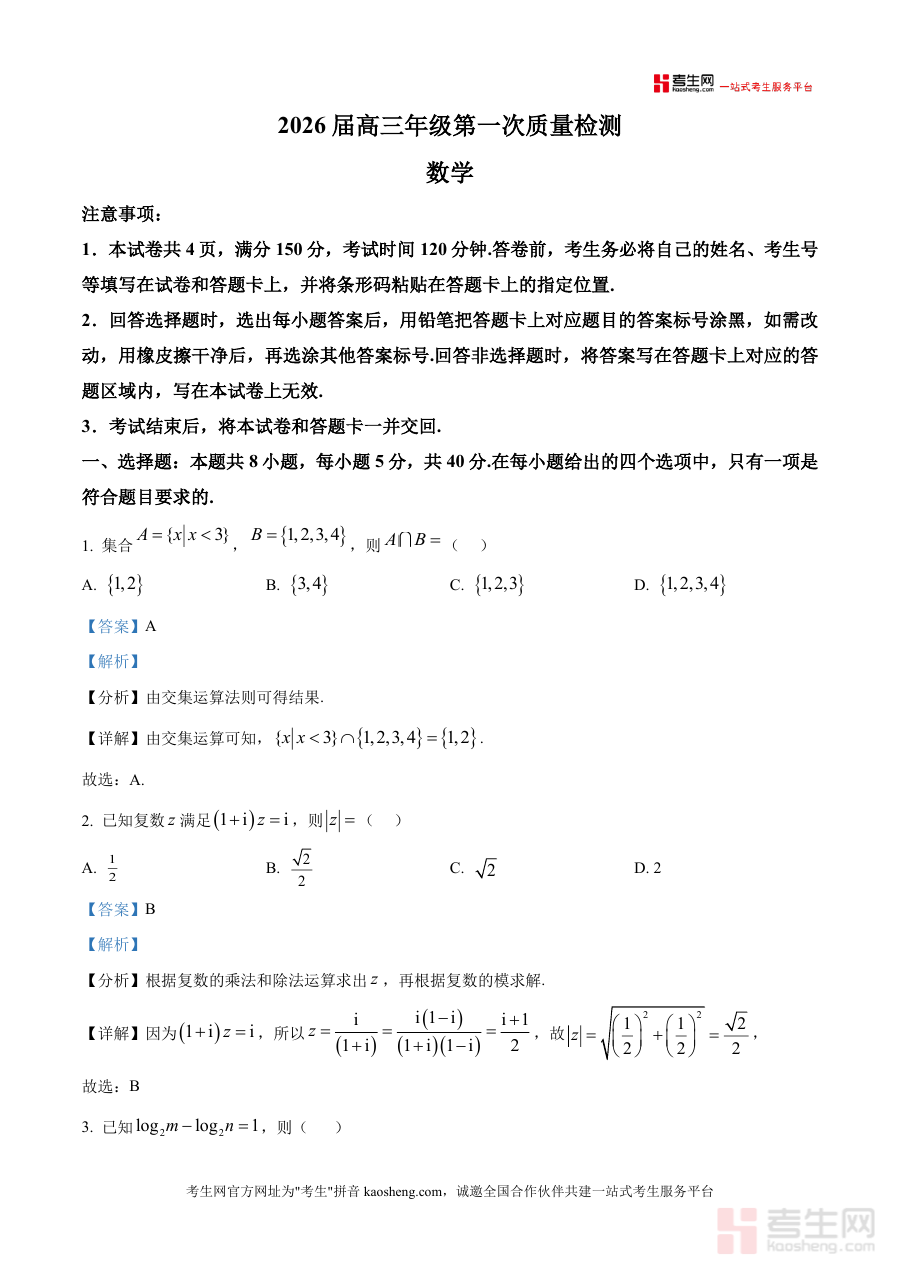 《精品解析:河南省开封市2026届高三第一次质量检测数学试题(解析版)》是一份针对河南省开封市2026届高三学生打造的高质量备考资料,整合本次质检完整试题及深度真题解析,覆盖选择题、填空题、解答题等全题型。其特色亮点在于解析过程兼顾基础回顾与方法提炼:每个题目均包含"分析-详解-易错点提示"模块——分析部分明确解题思路方向,详解部分展示规范步骤,易错点提示精准指出易混淆疏漏之处,同时融入数形结合、分类讨论等数学思想,帮助学生构建清晰解题逻辑框架。