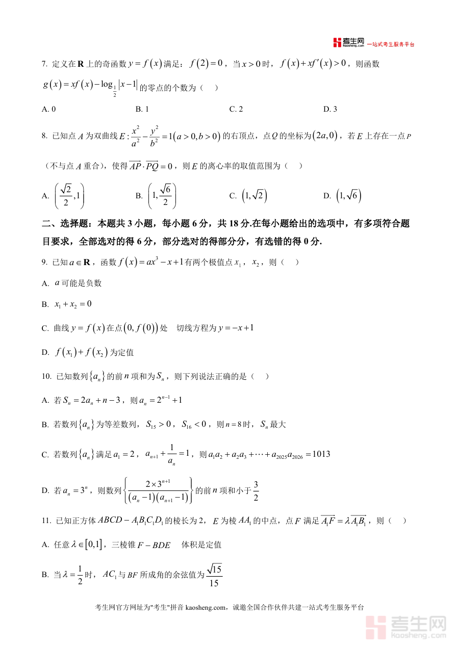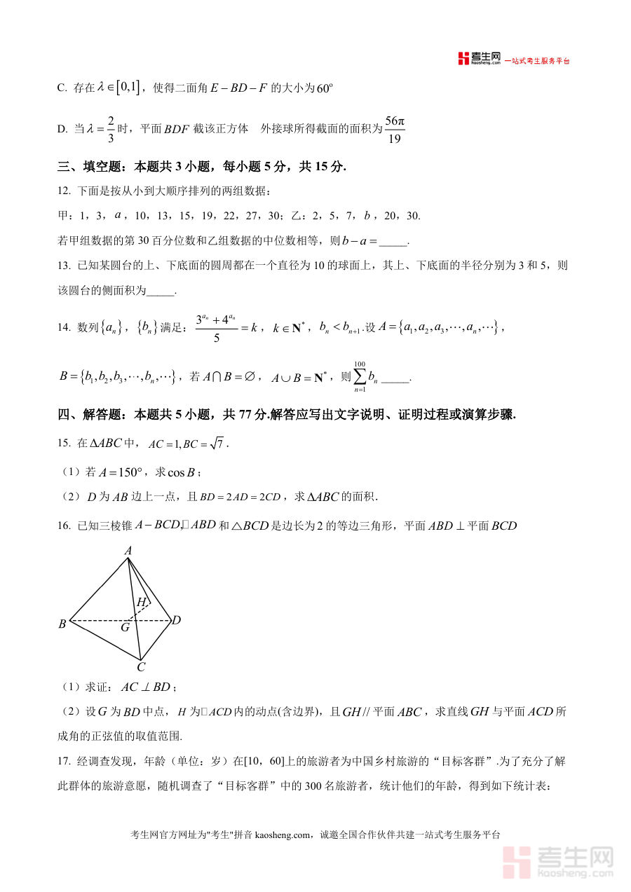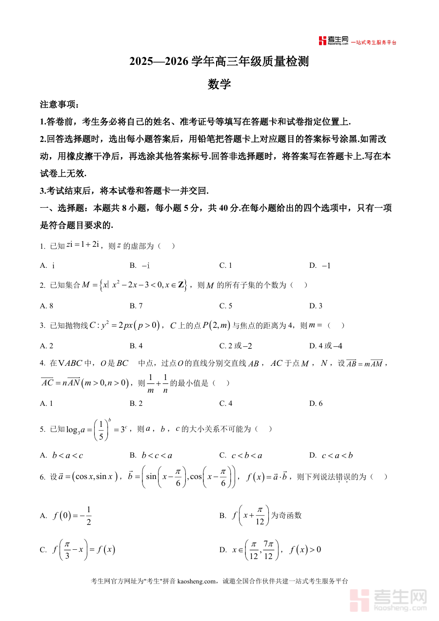 《精品解析:河南省洛阳市豫西北联盟(洛阳二测)2026届高三第二次质量检测数学试题(原卷版).docx》是一份聚焦豫西北联盟区域联考命题特色、服务高三数学备考的核心真题资料。文件完整呈现2025—2026学年高三第二次质量检测数学试卷全貌,严格遵循高考题型结构:包含8道单选题(覆盖复数虚部计算、集合子集个数等基础考点)、3道多选题(涉及函数极值性质、数列综合应用等内容)、3道填空题(含圆台侧面积计算、数列递推问题等)及5道解答题(涵盖解三角形面积求解、立体几何线面垂直证明与线面角范围分析、概率统计分布列与期望计算、椭圆伴随圆综合问题及函数极值与不等式证明等核心模块),并附标准答卷注意事项。其特色在于保留联考原卷命题逻辑与难度梯度,还原真实考试场景,为使用者提供精准试题体验。