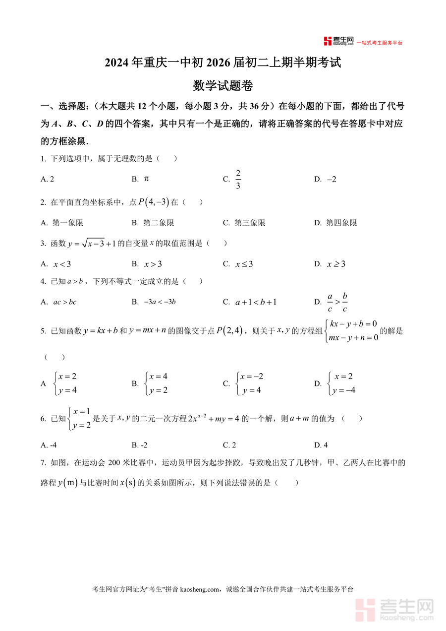 《精品解析:重庆市第一中学校2024-2025学年上学期期中考试八年级数学试题(原卷版)》是一份聚焦重庆一中初二年级期中数学考查的权威真题资料。该资料完整呈现该校初2026届初二上期半期考试数学试题原貌,内容涵盖选择题(12小题)、填空题(8小题)及解答题(8小题)三大题型,总分值82分,覆盖无理数识别、平面直角坐标系象限判定、一次函数图像性质与应用、二元一次方程组求解、等腰三角形性质等八年级数学核心知识点模块,题型设计贴合重庆中考数学命题趋势,精准反映该校教学重点与期中考查方向。