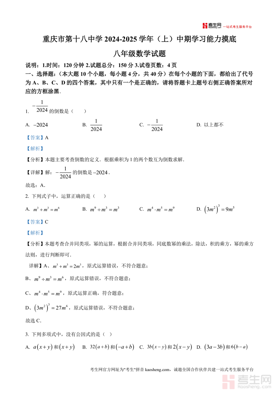 《精品解析:重庆市第十八中学2024--2025学年上学期八年级数学期中考试卷(解析版)》是一份专为重庆市第十八中学八年级学生打造精准匹配期中教学进度与考点要求备考资料涵盖完整试卷题目及对应详细解析包含选择填空解答三大题型每个题目解析均明确考点如倒数定义三角形全等判定无理数估算等并提供分步推导过程帮助学生理解解题逻辑与知识应用特色亮点在于结合该校教学实际突出重点难点针对易错题型给出思路点拨助力学生构建清晰知识框架