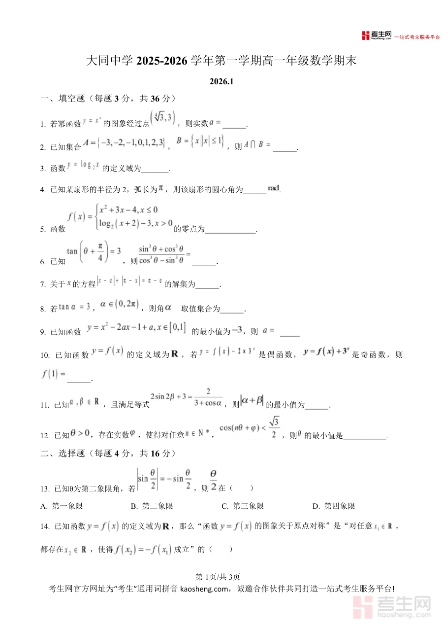 《精品解析:大同中学2025-2026学年第一学期高一年级数学期末(原卷版).docx》是一份针对大同中学高一年级学生数学期末备考的权威真题资料,涵盖填空题(36分)、选择题(16分)、解答题(48分)三大题型共21道题目,覆盖幂函数图象与性质、集合运算、函数定义域与零点、三角函数基本关系与象限判断、不等式求最值、实际应用问题及逻辑证明等高一数学核心知识点。该资料保留了学校考试的原始题型结构、分值分布及命题风格,能真实反映该校教学重点与命题导向,为使用者提供原汁原味的考试场景还原。