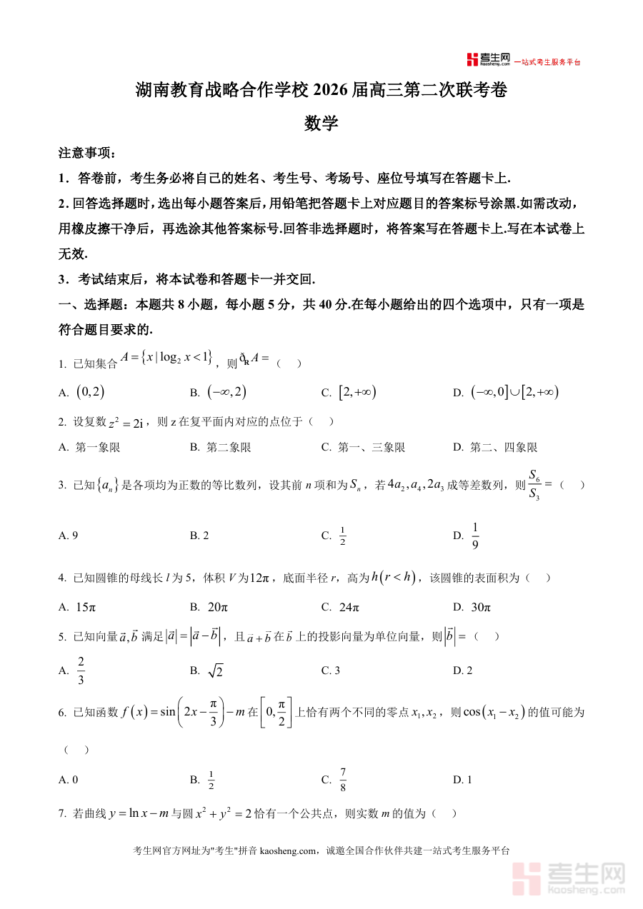 《精品解析:湖南省教育战略合作学校2025-2026学年高三上学期第二次联考数学试题(原卷版).docx》是一份面向高三学生数学备考阶段的权威联考真题资料,核心定位为新高考背景下的阶段性检测工具。该试题包含完整试卷结构,涵盖8道单项选择题、3道多项选择题、3道填空题及5道解答题,覆盖集合运算、复数几何意义、等比数列性质、圆锥表面积计算、向量投影等高中数学核心知识点。其特色亮点在于由湖南省教育战略合作学校联合命制,题型设置严格遵循新高考命题要求(如多选题的引入),考查深度与广度贴合近年高考命题趋势,能有效反映学生对知识体系的掌握情况。
