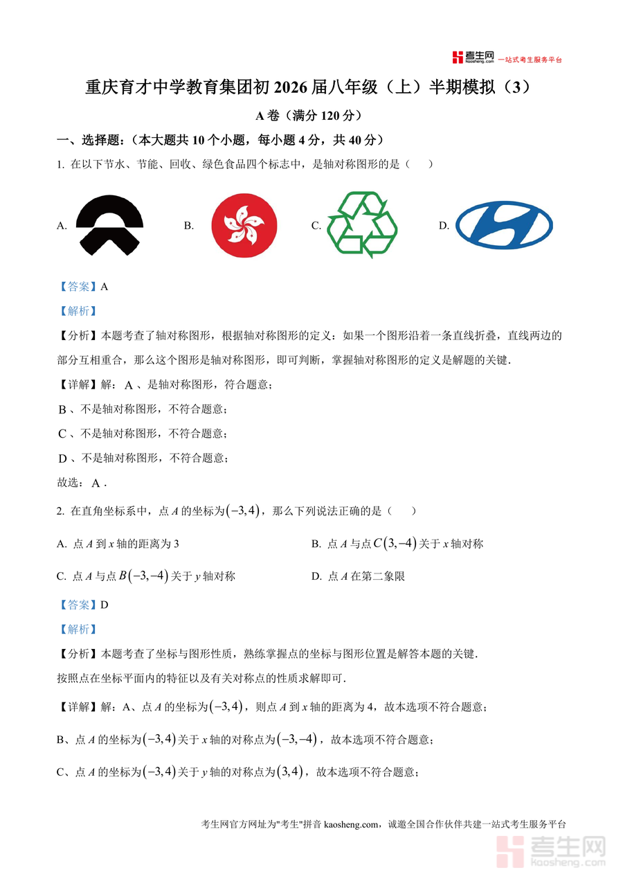 《精品解析:重庆市育才中学教育集团2024—2025学年八年级上学期半期模拟数学试题(解析版).docx》是一份针对重庆市育才中学教育集团八年级上学期数学半期考试设计的专业备考资料,涵盖选择题(如轴对称图形判断、坐标与图形性质)、填空题(如完全平方公式应用)及解答题(如因式分解)等题型,每个题目配备详细解析包括考点分析与解题思路,精准覆盖全等三角形判定等核心知识点,兼具针对性与实用性的真题解析类资料。