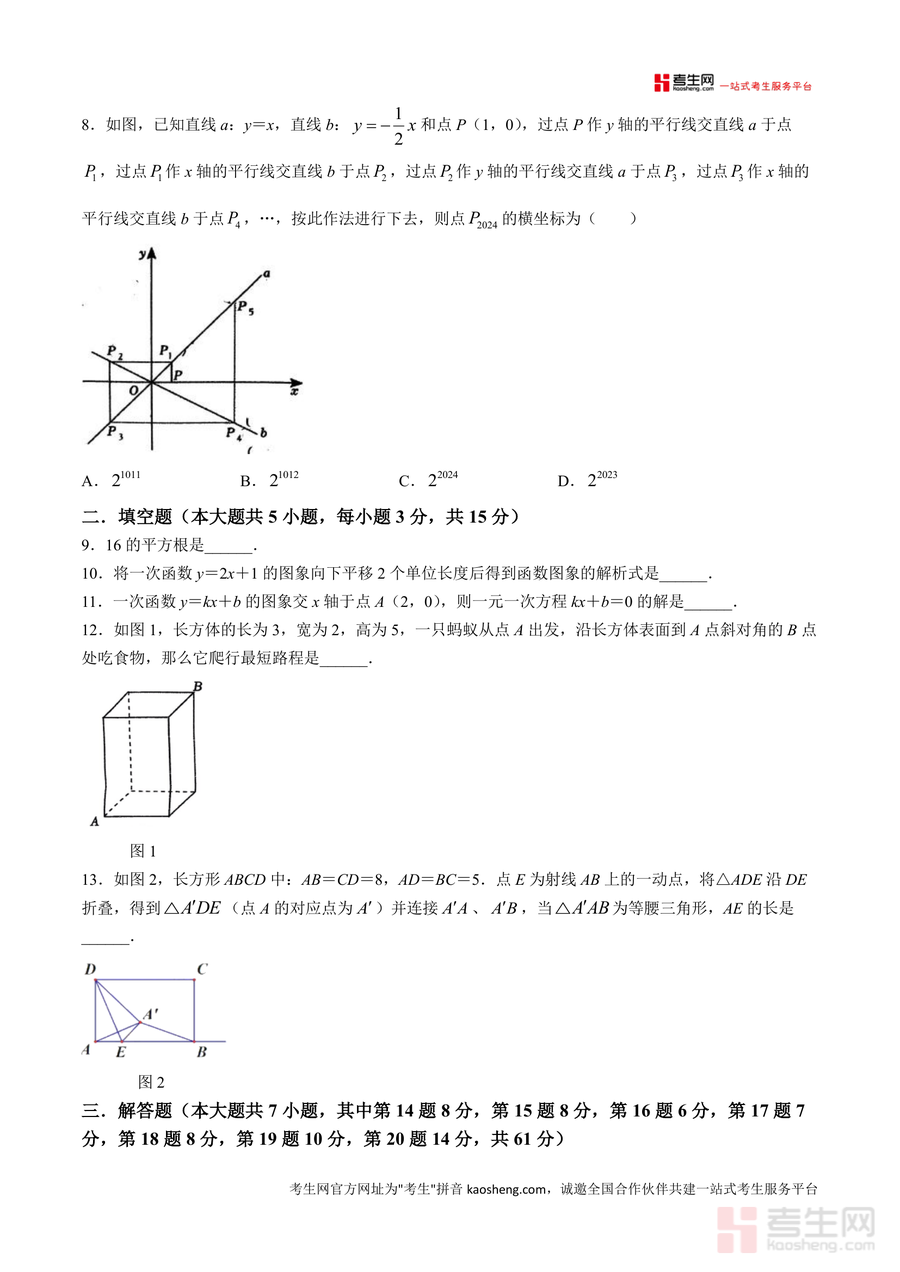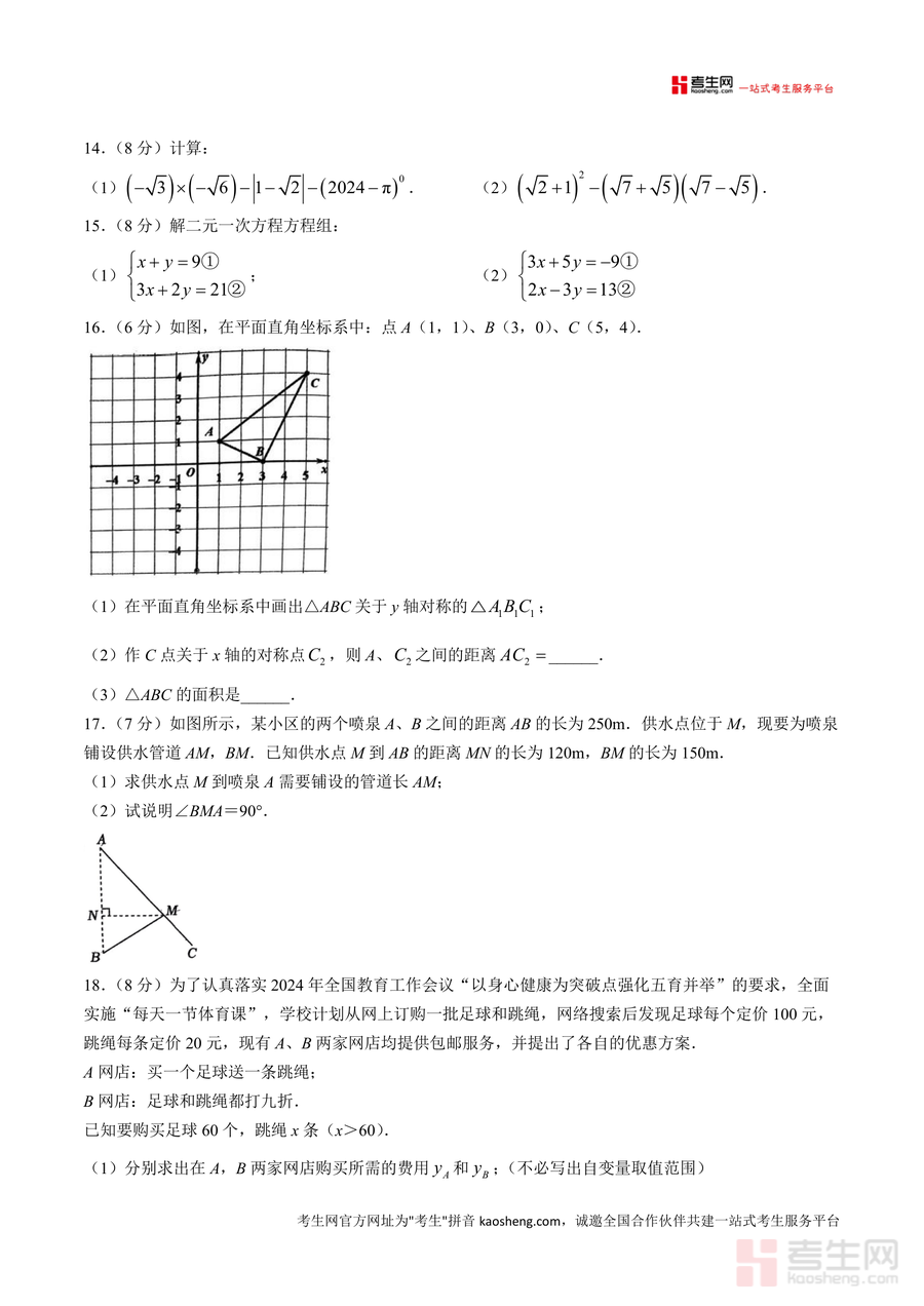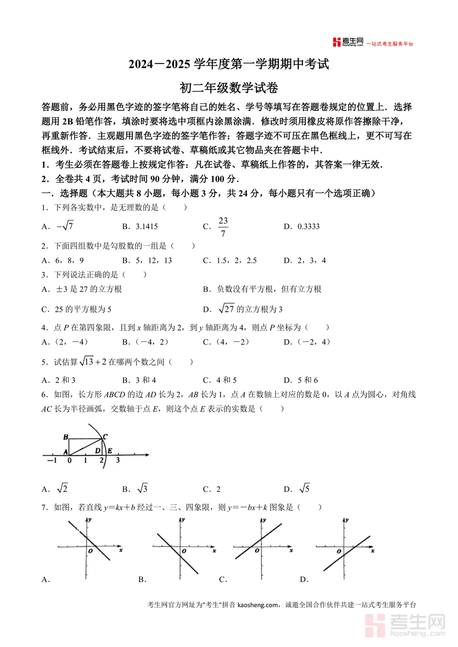 《广东省深圳市福田区外国语学校(集团)2024-2025学年八年级上学期11月期中考试数学试题.docx》是一份贴合深圳福田区初中数学教学进度与评价标准的校级期中测试真题资料,涵盖八年级上册核心知识模块,包括实数(无理数判断、平方根与立方根计算)、勾股定理应用、平面直角坐标系中点的坐标特征、一次函数图象与性质及应用、几何图形折叠与最短路径问题等内容。试题题型结构清晰合理,分为选择题(8小题共24分)、填空题(5小题共15分)、解答题(7小题共61分),既包含基础概念辨析题如勾股数判断、一次函数平移,也设置了综合性探究题如函数图象分析与几何动态问题求解,能全面考查学生对知识的掌握程度与应用能力。