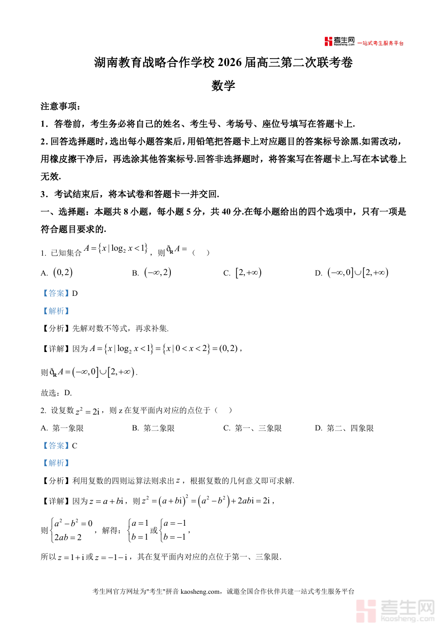 《精品解析:湖南省教育战略合作学校2025-2026学年高三上学期第二次联考数学试题(解析版)》是一份针对湖南优质学校联考数学试题研发 的专业备考资料。内容涵盖整套试题的选择题、填空题、解答题全题型详细解析,覆盖集合与逻辑、复数运算、数列性质、圆锥曲线、空间几何等高中数学核心模块。特色亮点在于解析过程结合“考点分析+步骤详解+易错提示”三维度呈现,如空间几何题中坐标系构建技巧、函数导数题中的极值点判定方法等均有深入拆解,兼具权威性与实用性。