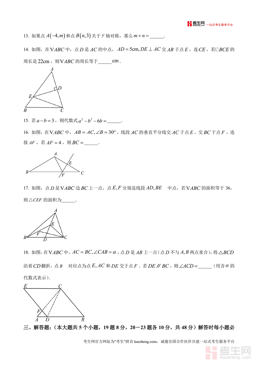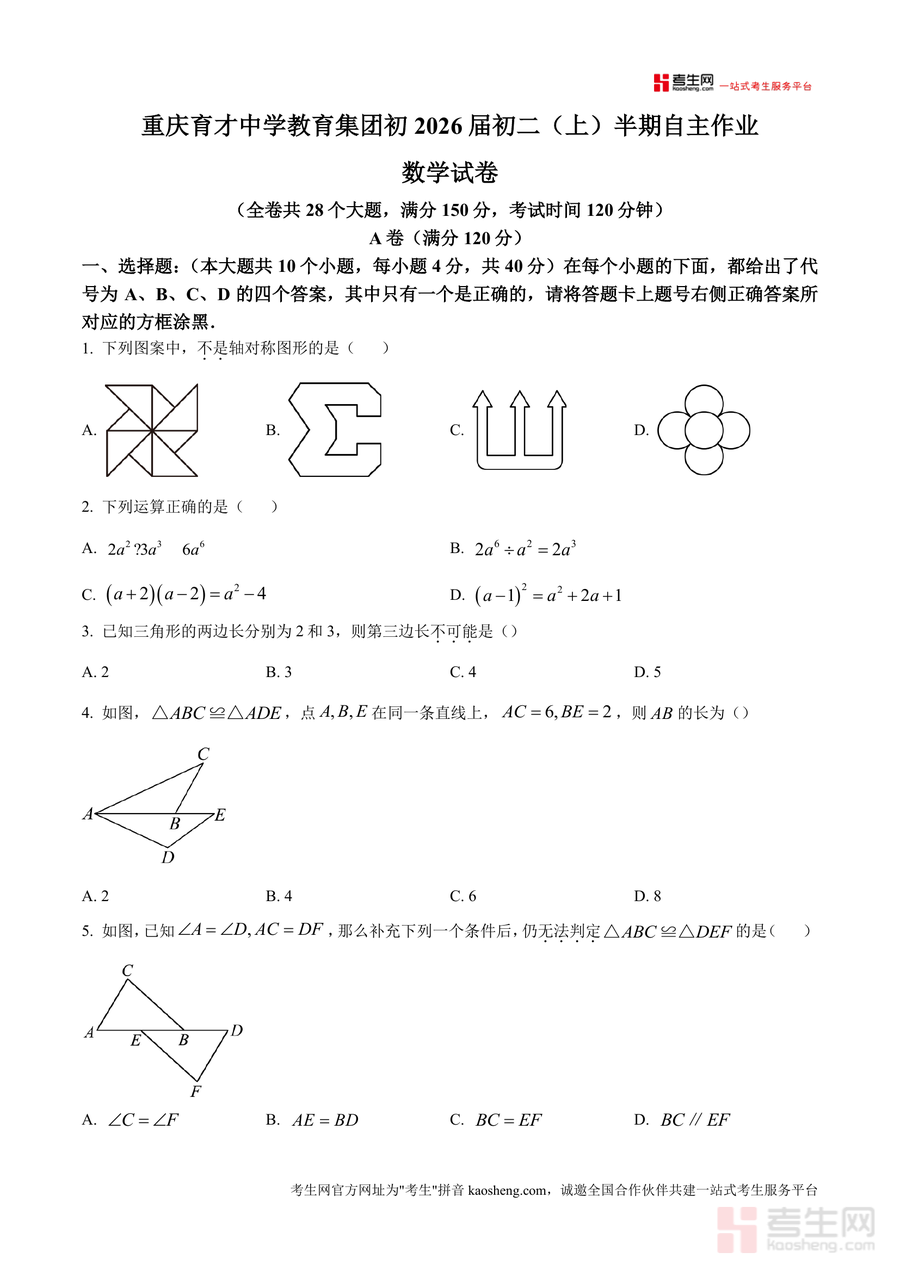 本资料适用于重庆育才中学教育集团初二年级在读学生、其他学校初二学生期中备考参考及初中数学教师教研使用。作为期中备考核心资料,真题是最直接反映考试要求与区域教学重点依据,具有不可替代性;原卷版呈现方式能让使用者沉浸式体验真实考试情境,增强临场应对能力;长期来看,该资料可作为后续复习时回顾核心考点与典型题型重要素材,帮助巩固数学基础,为后续几何与代数综合学习奠定坚实基础。