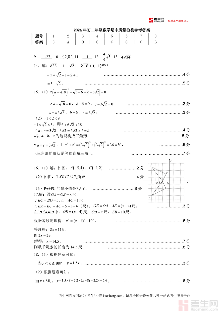 该文件核心用途是辅助学生自查期中检测答题情况、掌握正确解题方法及评分规则。使用场景包括学生完成试卷后的自我纠错(对照答案修正错误步骤)、教师课堂讲评时作为参考范本(解析题目得分点)、家长辅导孩子复习时的权威依据。用户价值体现在通过分析参考答案中的步骤细节提升应试能力,例如应用题(第17题秋千绳索问题)中的方程建立与求解过程,帮助学生理解如何将实际问题转化为数学模型;备考优势是让使用者熟悉期中检测题型分布与难度梯度,针对性弥补知识漏洞。