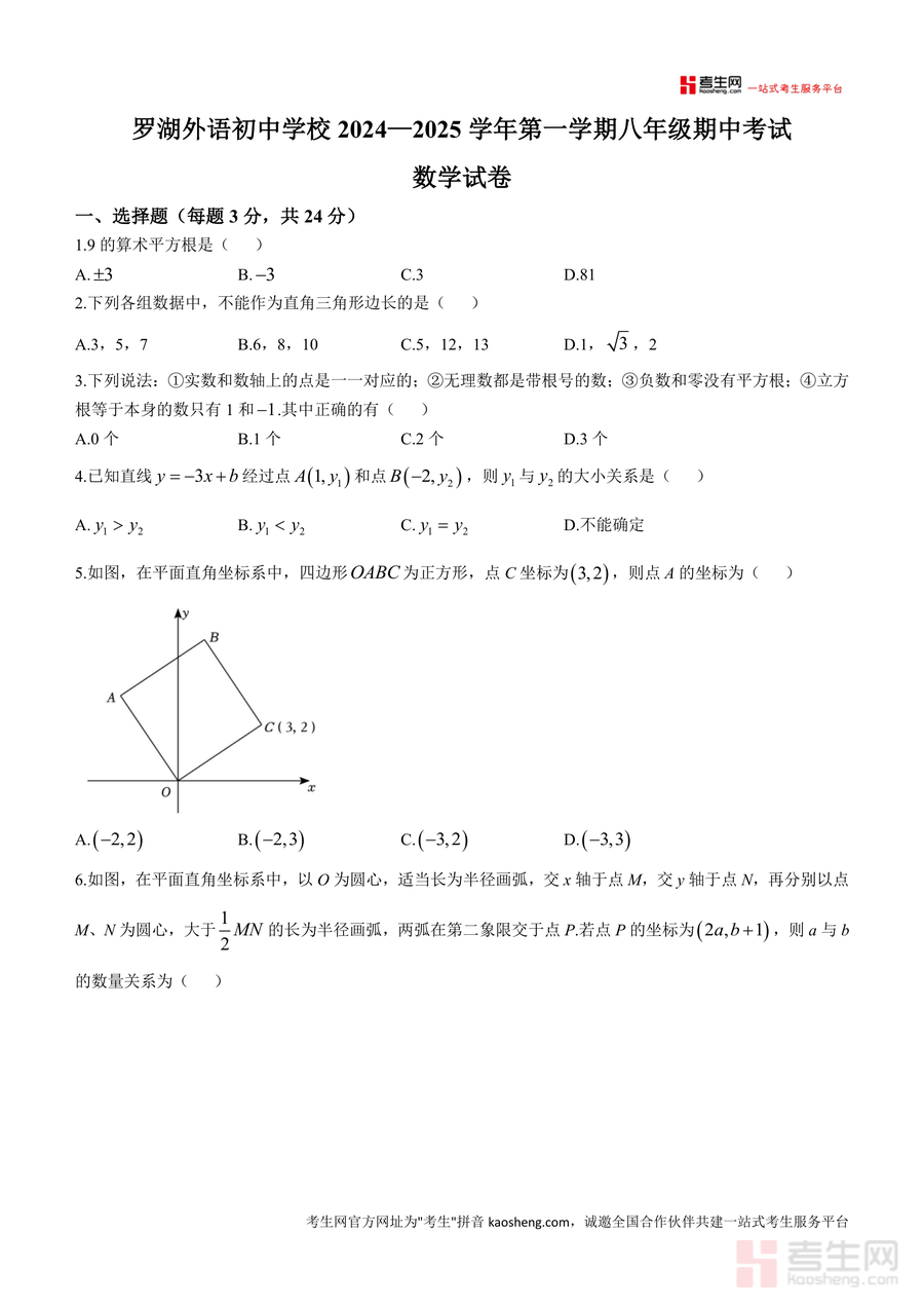 《广东省深圳市罗湖外语初中学校2024-2025学年八年级上学期期中考试数学试题.docx》是一份针对该校八年级上学期期中数学考试设计的专业备考资料。文件包含完整试题及详细参考答案与解析,试题涵盖选择题、填空题、解答题三大题型,覆盖实数运算、勾股定理、一次函数等核心知识点。其特色在于贴合深圳本地教学大纲与罗湖外语初中命题风格,并通过多样化题型考查学生对知识的综合应用能力,解析部分对关键步骤进行了深入讲解,帮助学生理解解题逻辑。