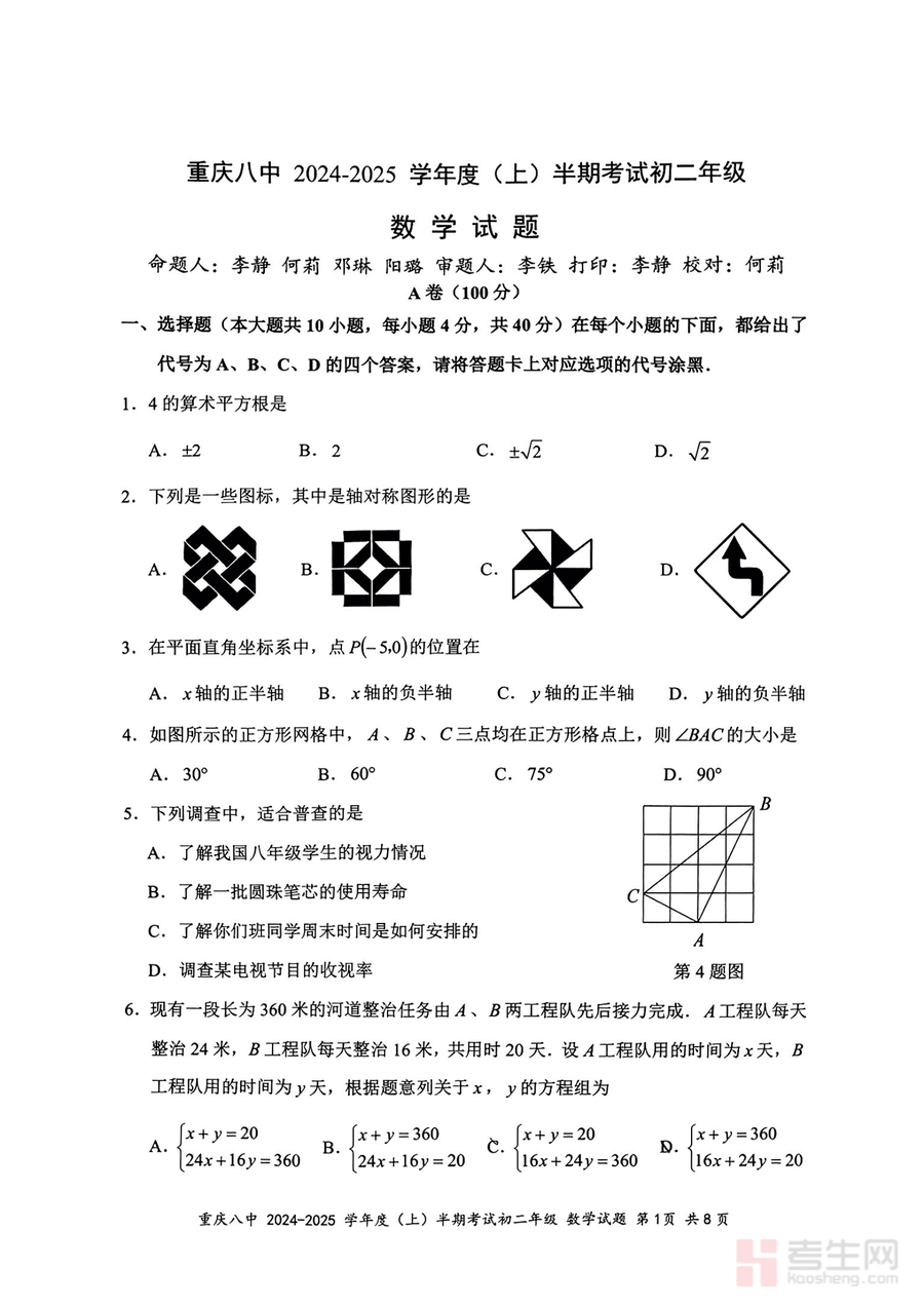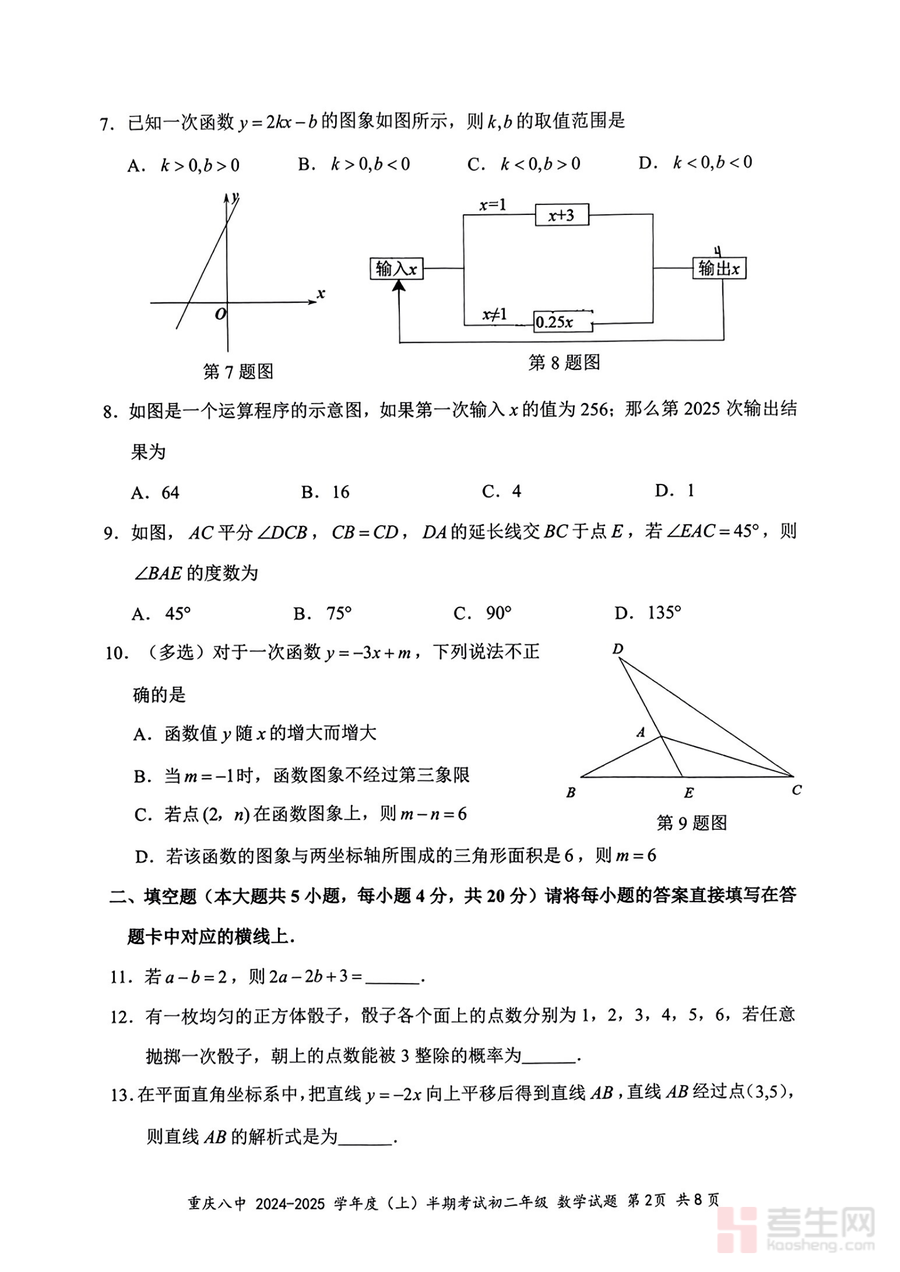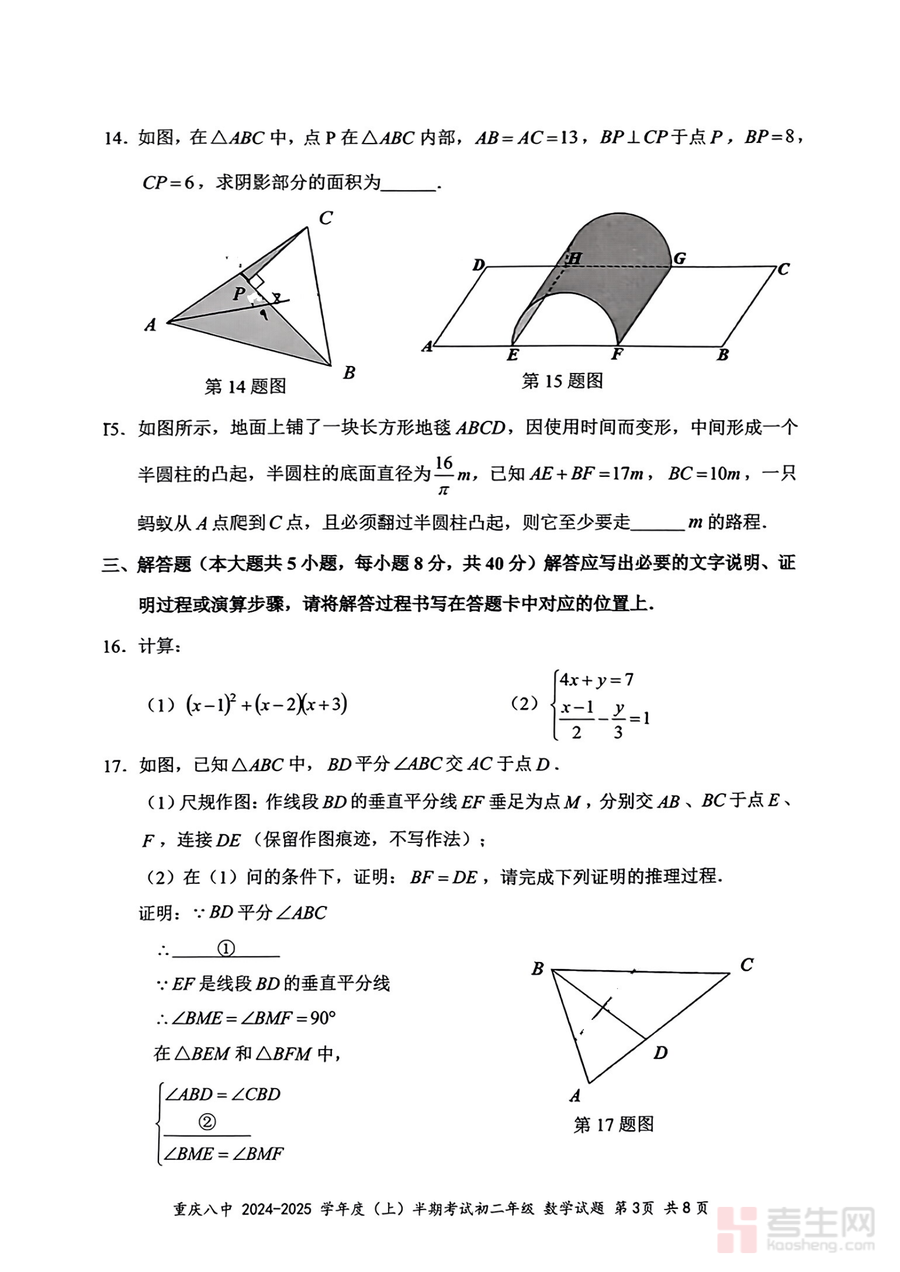《重庆市第八中学校2024-2025学年八年级上学期期中考试数学试题.pdf》是一份由重庆八中官方命制的八年级上学期期中数学真题资料,核心覆盖整式的乘除与因式分解、全等三角形、轴对称、一次函数等八年级上册数学核心知识点。试题严格遵循重庆市初中数学教学大纲及中考命题趋势,题型包含选择题、填空题、解答题等常规考试题型,且题目设计兼具基础性与选拔性——基础题占比约60%,聚焦核心概念与技能的考查;中档题与难题占比约40%,侧重知识综合应用与逻辑思维能力的提升,体现了名校命题的严谨性与针对性。