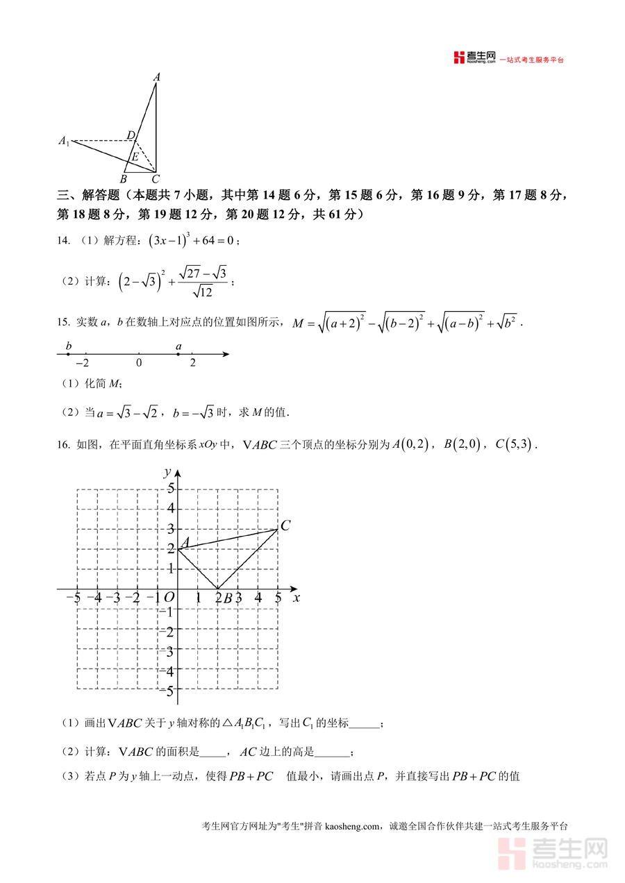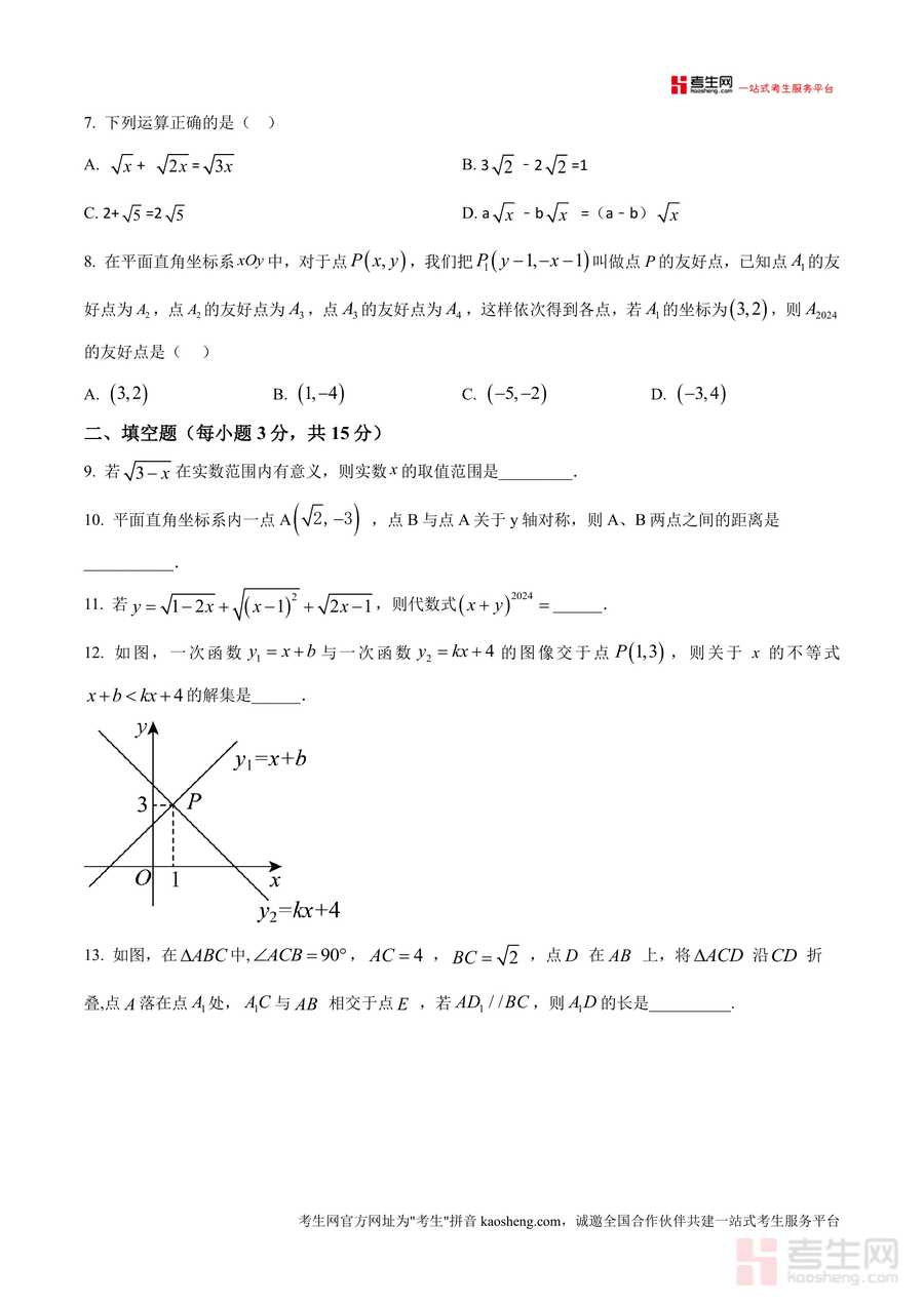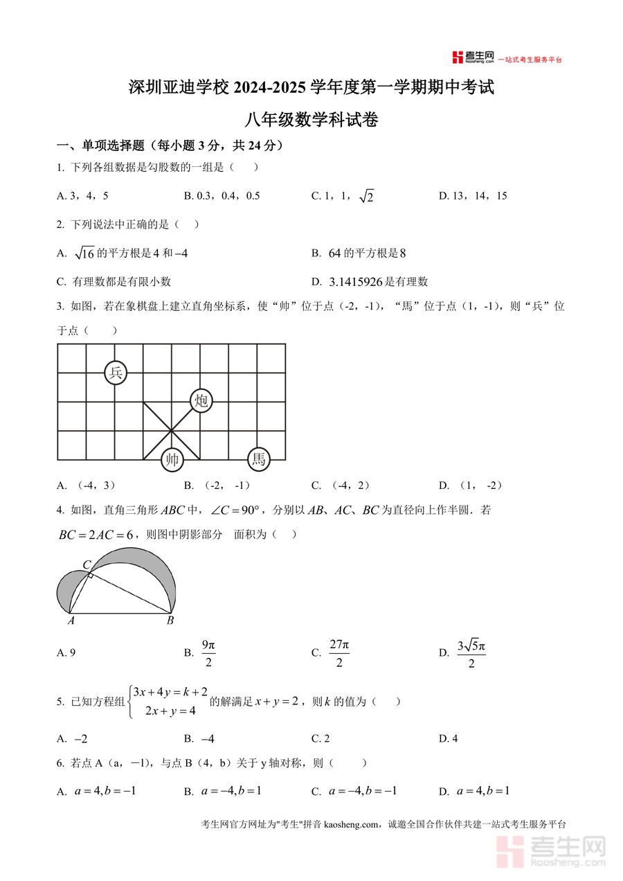 《精品解析:广东省深圳亚迪学校2024-2025学年八年级数学上学期期中考试试卷(原卷版)》是一份针对该校八年级学生期中数学备考的权威真题资料。该试卷严格遵循深圳亚迪学校教学进度与命题风格,涵盖勾股定理应用、平方根与实数运算、平面直角坐标系等核心知识点,题型包括单项选择(24分)、填空题(15分)及解答题(61分),完整还原期中考试命题结构与难度梯度。其特色在于保留该校特有的命题细节与考点分布,如坐标系中友好点规律探究、几何折叠问题等,为学生提供最贴近真实考试场景的训练素材。