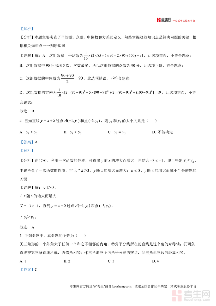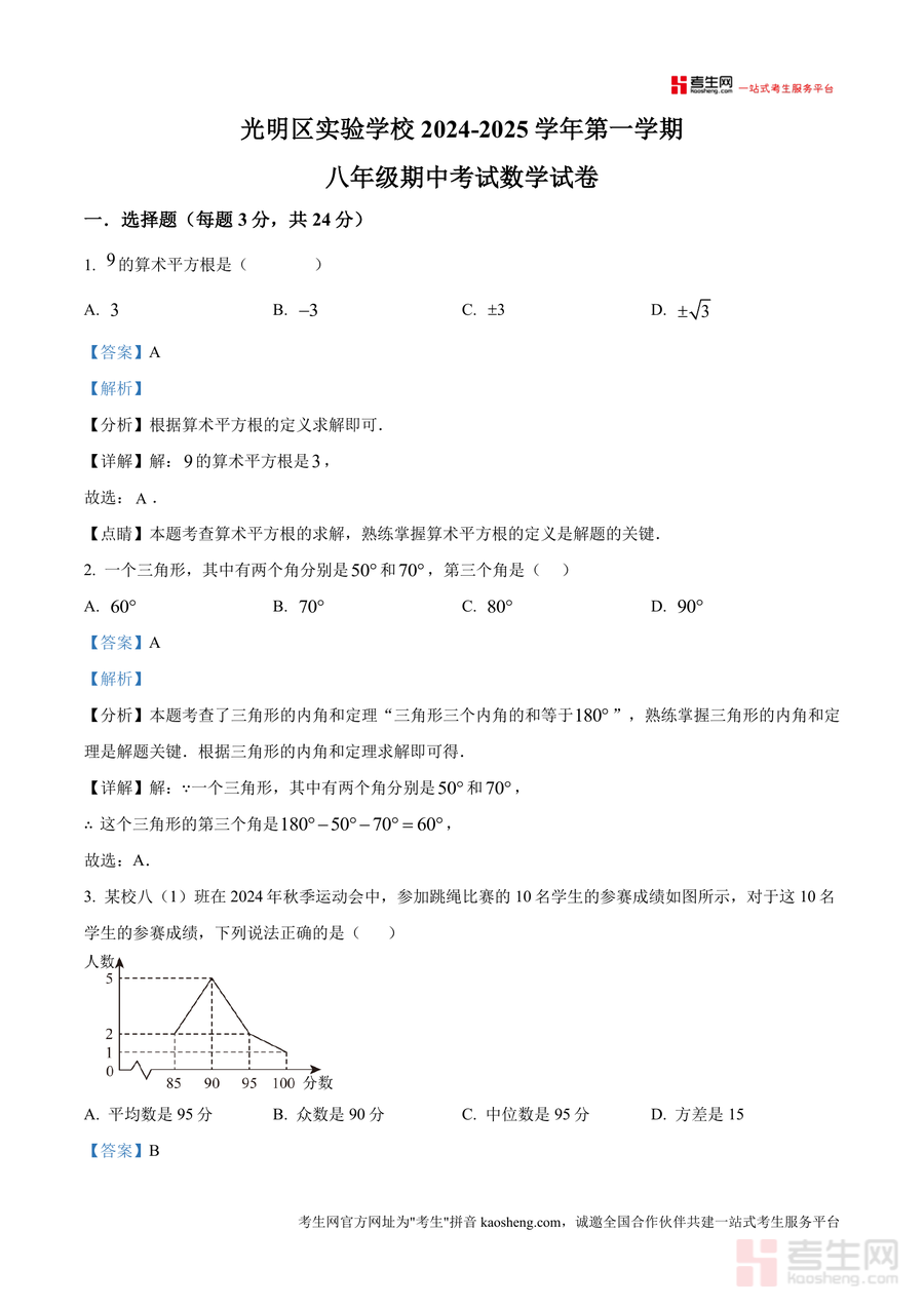 《精品解析:广东省深圳市光明区实验学校2024-2025学年上学期八年级期中考试数学试卷(解析版).docx》是一份针对光明区实验学校八年级学生期中备考设计核心资料,包含该校期中真题全题型内容(选择题8道、填空题5道、解答题6道)及专业解析。资料特色在于每道题配备考点定位(如第3题涉及统计量辨析、第7题坐标轴对称性质)、步骤详解与易错点睛,同时融入教材核心知识点(三角形内角和定理、一次函数性质、勾股定理等),既保持真题权威性又兼顾备考实用性,是精准对接校考要求的优质备考资料。