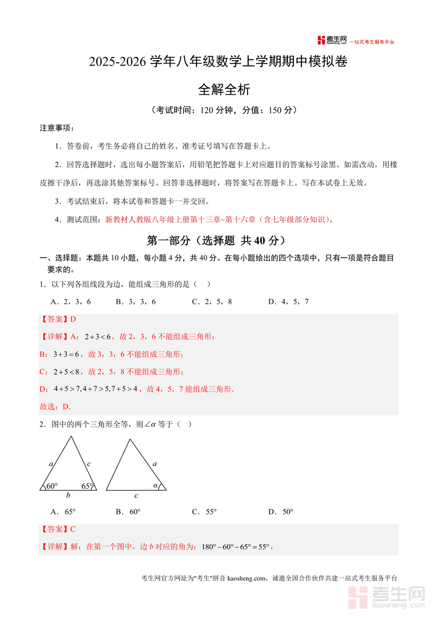 《八年级数学期中模拟卷(全解全析)(重庆专版,新教材人教版).docx》是一份针对重庆地区八年级学生设计的期中备考资料,核心内容涵盖符合2025-2026学年人教版新教材要求的期中模拟试卷及全解全析,测试范围明确包含八年级上册第十三章至第十六章及七年级部分关联知识。该资料特色在于重庆专版地域适配性,贴合本地期中命题趋势;全解全析覆盖所有题型,从选择题选项分析到解答题完整步骤推导,精准呈现考点逻辑;同时严格遵循考试时间120分钟、分值150分标准格式,包含规范注意事项,还原真实考试场景,助力学生熟悉应试流程。