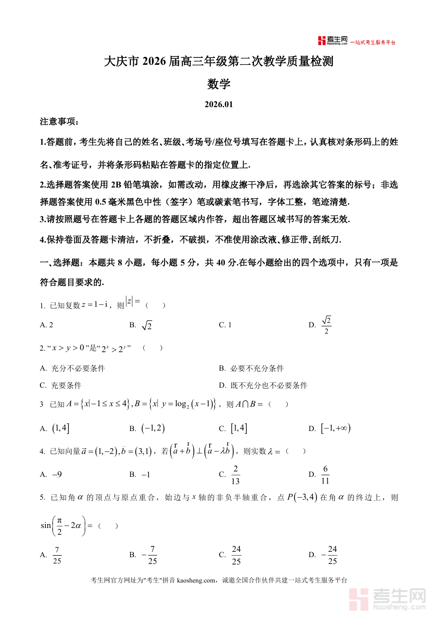 本资料适用于大庆市2026届高三学生、高中数学教师及备考辅导人员。作为区域重要教学质量检测资源,其必要性在于真实反映本地教学水平与考生实际学情;不可替代性在于深度贴合大庆本地考纲要求与命题风格;长期价值则表现为可作为高三复习阶段的经典参考资料留存,助力考生持续巩固知识体系、优化解题策略与提升综合应试能力。