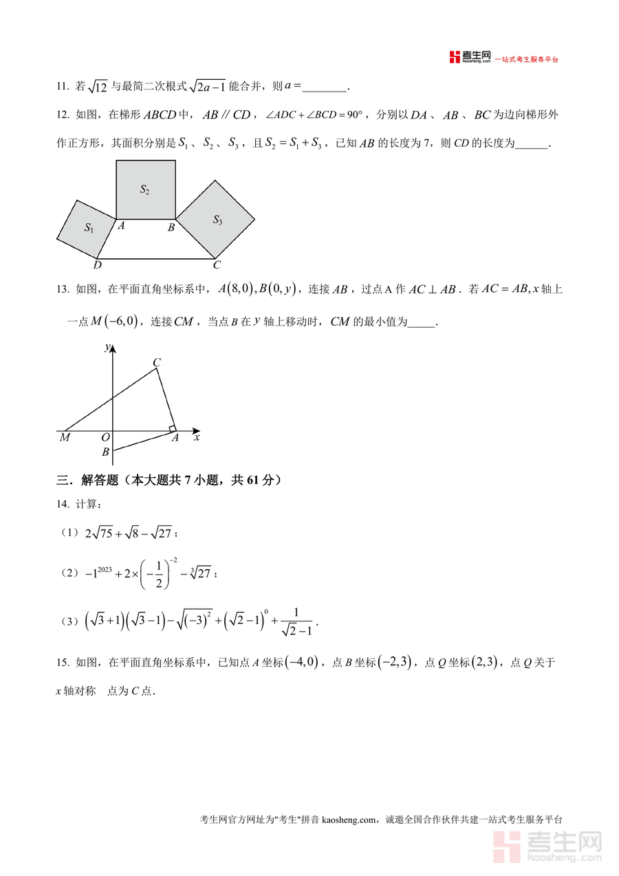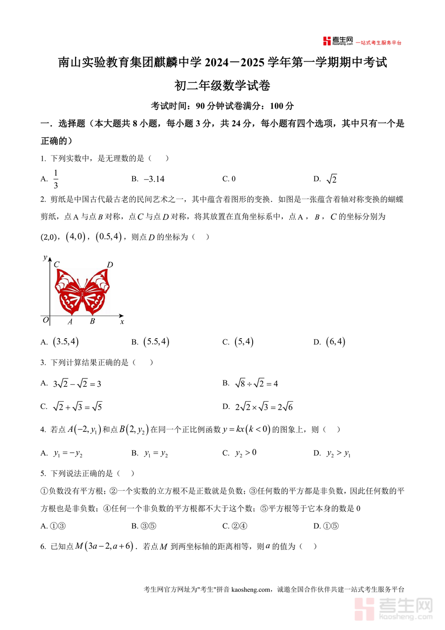 《精品解析:广东省深圳市南山实验教育集团麒麟中学2024-2025学年八年级上学期期中考试数学试卷(原卷版)》是一份针对本地初中数学教学进度与考试要求的精准备考资料。该试卷严格遵循90分钟考试时长、100分满分标准编制,包含选择题(8小题共24分)、填空题(5小题共15分)及解答题(7小题共61分)三大题型板块。内容覆盖实数分类、轴对称变换、函数关系应用、几何图形计算等八年级上册核心知识点,并融入本地教育特色元素如南山城区标识相关题目设计,能有效反映学校教学重点与命题风格。