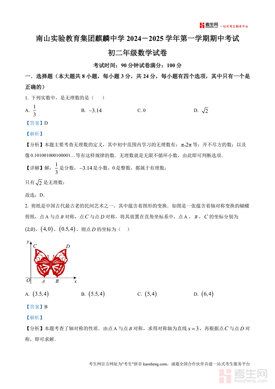 《精品解析:广东省深圳市南山实验教育集团麒麟中学2024-2025学年八年级上学期期中考试数学试卷(解析版)》是一份针对该中学八年级上学期期中数学考试设计专业备考资料,包含完整试卷原题(选择题8道、填空题5道、解答题7道)及逐题详细解析。资料覆盖实数概念(如无理数判断)、轴对称变换(坐标对称应用)、二次根式运算(合并与化简)、一次函数应用(图像分析)、勾股定理等核心考点,采用"考点分析+步骤详解+易错提示"结构,既给出正确答案又揭示解题逻辑及知识关联,特色在于贴合校考命题方向且注重方法迁移训练。
