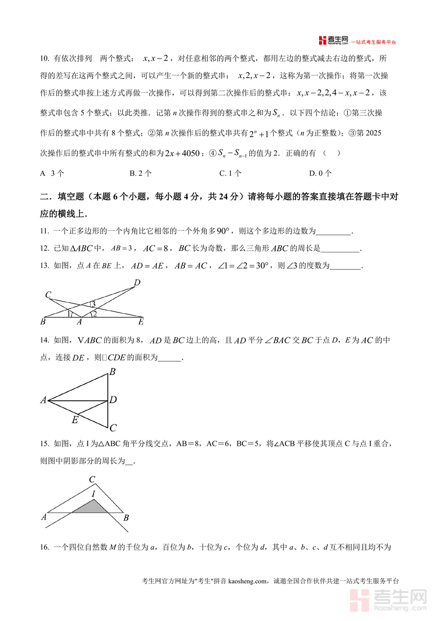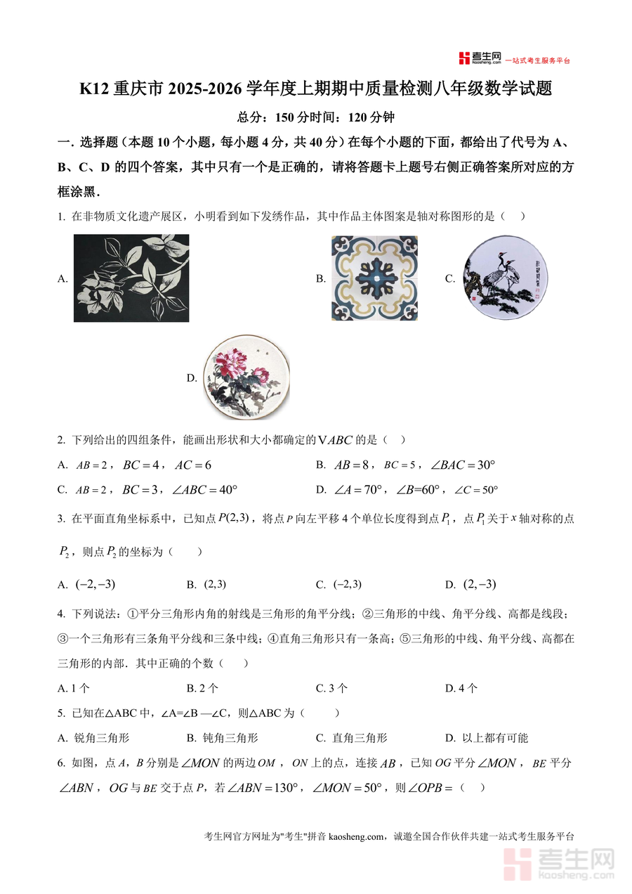 《精品解析:K12重庆市2025-2026学年八年级上学期11月期中数学试题(原卷版).docx》是一份契合重庆市八年级上学期期中数学检测标准设计的标准化原卷资料。该资料严格按照本地期中检测规格编制,总分150分、考试时长120分钟,涵盖选择题(10小题共40分)、填空题(6小题共24分)及解答题(9小题共86分)三大题型,题目覆盖轴对称图形识别、三角形全等判定与性质、平面直角坐标系平移与对称、多边形内角外角计算等核心知识点,题型梯度设置科学,包含基础巩固题、能力提升题及综合压轴题(如操作类规律探究题、几何综合证明题),能全面反映重庆本地期中数学检测的命题方向与难度水平。