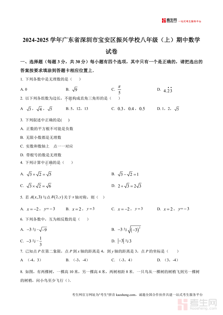 《精品解析:广东省深圳市宝安区振兴学校2024—2025学年上学期八年级期中数学试卷(原卷版).docx》是一份聚焦深圳宝安区振兴学校八年级上学期期中数学考查要求的优质备考资料。该试卷严格匹配该校教学进度与期中命题标准,包含30分选择题、15分填空题及解答题三大模块,覆盖实数分类、勾股定理应用、平面直角坐标系操作、一次函数图像分析等核心知识点,题型设置贴合深圳本地初中数学教学导向,精准呈现该校期中考查的重点内容与难度层次。
