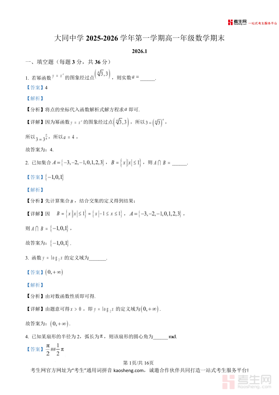 《精品解析:大同中学2025-2026学年第一学期高一年级数学期末(解析版).docx》是一份针对大同中学高一数学期末真题的专业备考资料,核心内容覆盖填空题、选择题、解答题三大题型,并包含幂函数性质、集合运算、三角函数恒等变换、函数定义域与零点等高一数学核心知识点。其特色亮点在于每道题均配备详细的思路分析与分步详解,不仅呈现正确答案,更通过易错点提示、公式推导过程及解题技巧总结帮助使用者理解题目本质而非单纯记忆解法,是兼具真题权威性与解析深度的优质学习资料。