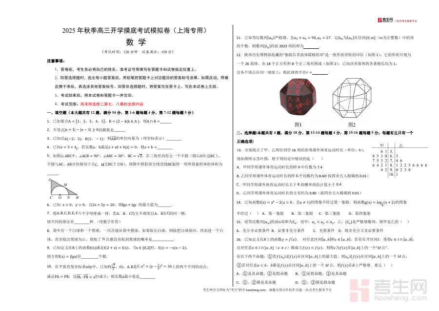 《2025年秋季高三开学摸底考试数学模拟卷(上海专用)(考试版A3).docx》是一份专为上海市高三学生设计的开学摸底数学模拟资料。该卷严格遵循上海高考数学命题规范,考试时间120分钟、满分150分,题型结构与真题一致——包含填空题(12题共54分)、选择题(4题共18分)及解答题(5题共78分),考试范围覆盖高考除选修二第七、八章外全部内容。其特色亮点在于题目设计贴合上海本地考情与最新命题趋势,并融入如独孤信多面体组印相关几何题等创新情境题型,既考查基础知识掌握程度又注重思维能力提升,是高质量的备考资料。