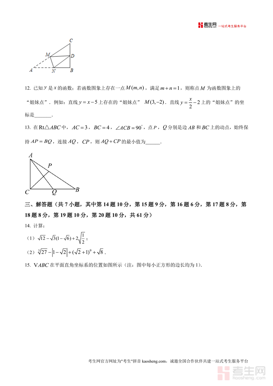 《精品解析:广东省深圳市宝安区七校联考2024-2025学年八年级上学期11月期中数学试题(原卷版)》是一份针对深圳宝安区七校联合期中检测设计的八年级数学真题资料。该资料完整呈现了联考原卷结构,包含8道选择题、5道填空题及7道解答题三大题型模块,覆盖无理数识别、直角三角形判定、一次函数性质等核心考点;试卷严格遵循本地教学大纲要求命题,并标注考试时间(90分钟)、满分分值(100分)及答题规范等细节信息,确保与实际考试场景高度一致。