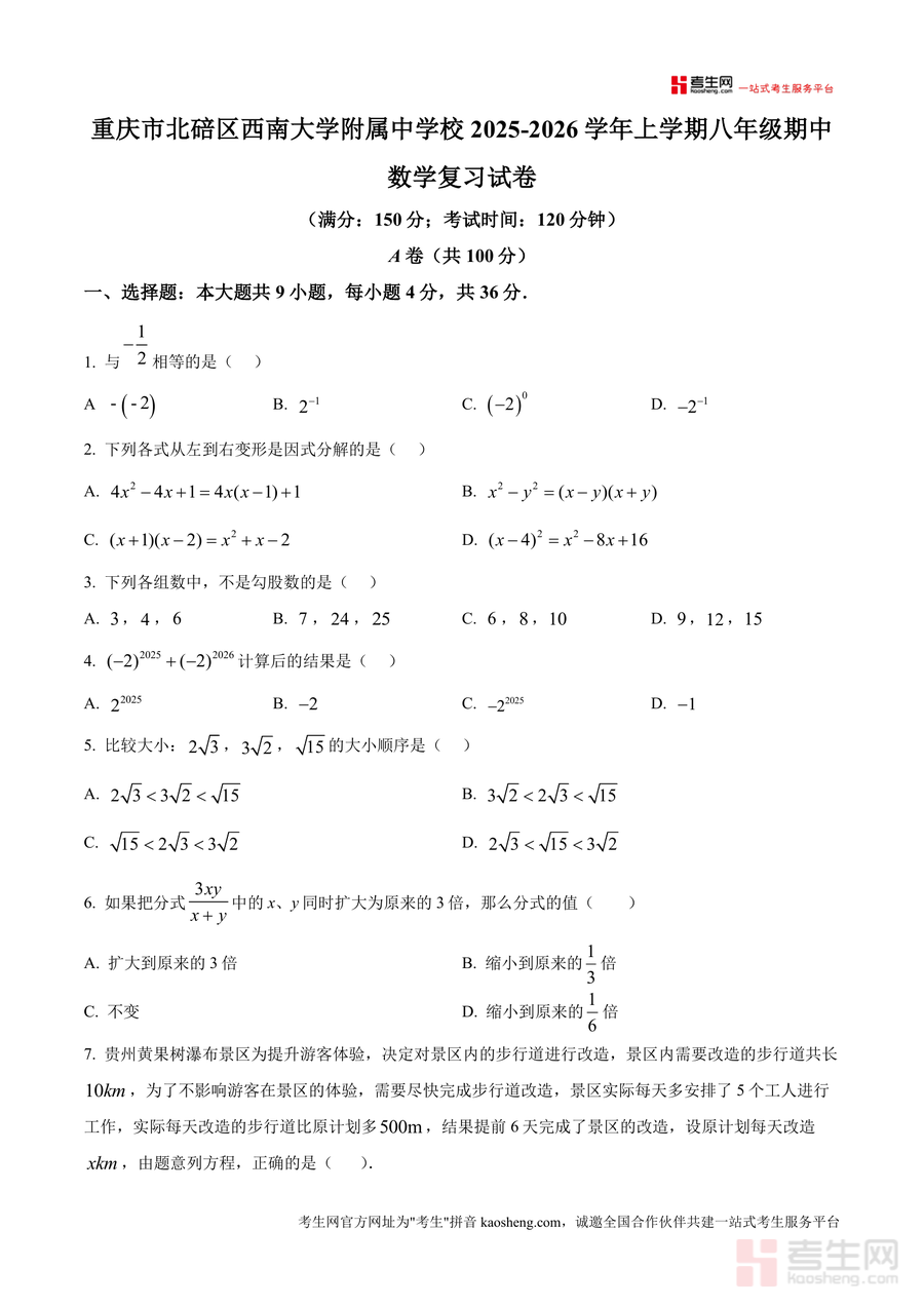 《精品解析:重庆市北碚区西南大学附属中学校2025-2026学年上学期八年级期中数学复习试卷(原卷版).docx》是一份针对西南大学附属中学校八年级上学期期中数学复习设计的精准备考资料,包含A卷(满分100分)与B卷(满分50分)两大部分,题型覆盖选择题、填空题、解答题三大类,内容涉及整式运算、因式分解、分式方程、勾股定理应用、二次根式性质等八年级上学期核心知识点,严格遵循该校期中命题结构与难度梯度,能精准呈现该校教学重点与考试方向。
