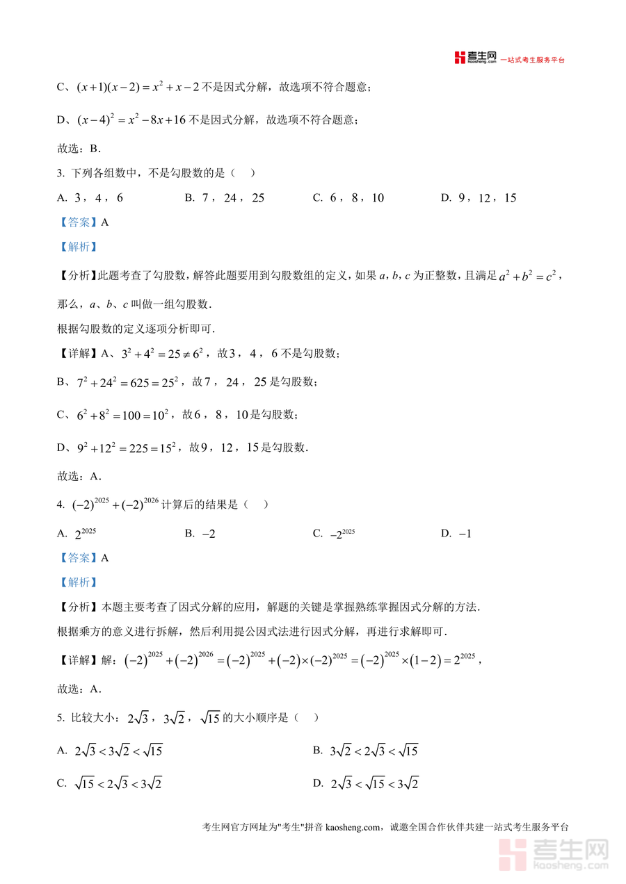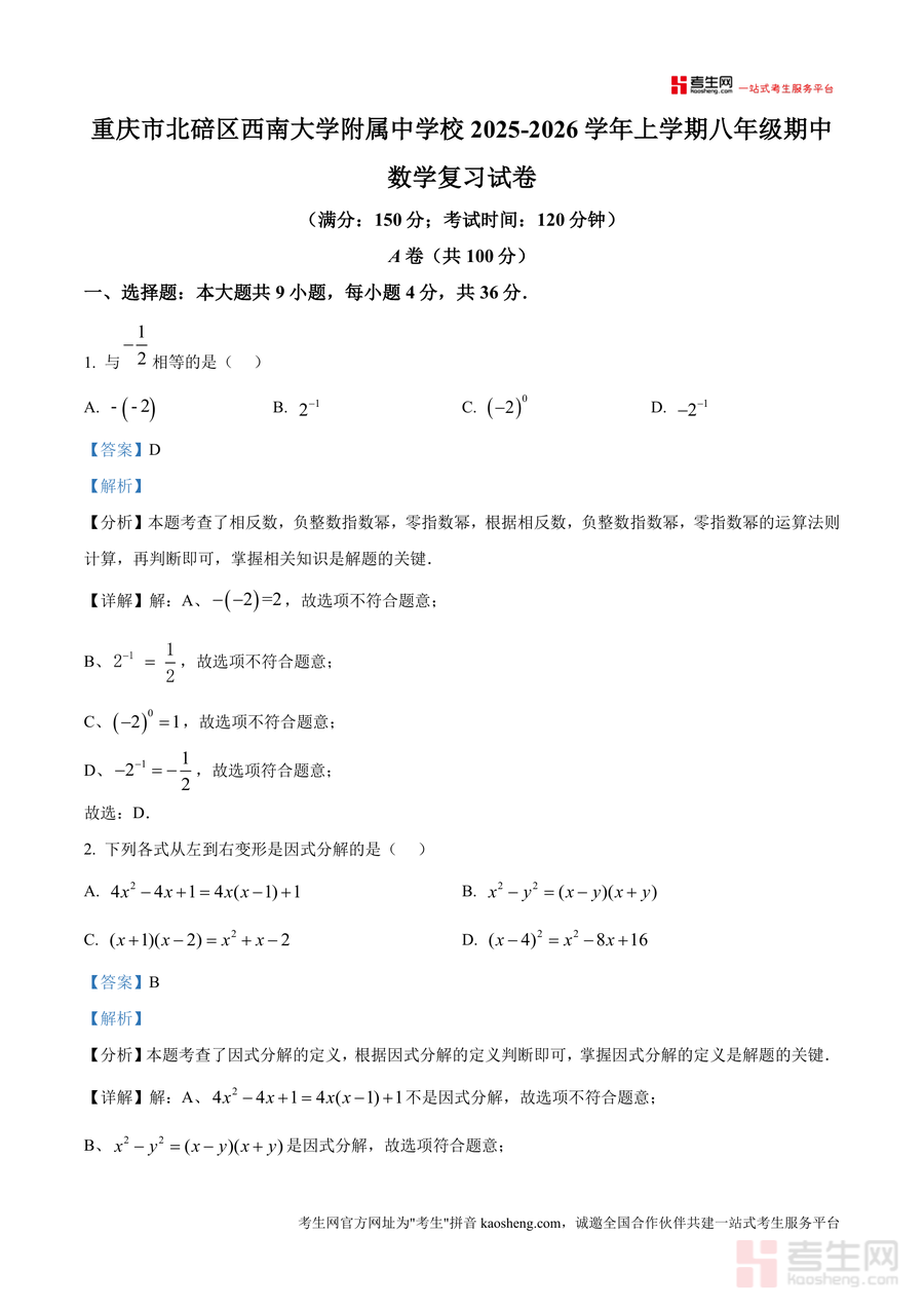 《精品解析:重庆市北碚区西南大学附属中学校2025-2026学年上学期八年级期中数学复习试卷(解析版)》是一份针对西南大学附中八年级学生期中数学备考设计专业复习资料。该资料包含A卷(满分100分)与B卷(满分50分)全题型深度解析,覆盖选择、填空、解答等核心题型,每个题目均配备详细考点分析、解题思路拆解及步骤说明,如对勾股数判断、因式分解定义辨析、分式方程增根问题等高频考点进行精准剖析,突出真题解析与考点关联,帮助学生把握命题方向,同时融入科学计数法、二次根式意义等基础知识点解析,兼顾知识巩固与能力提升。