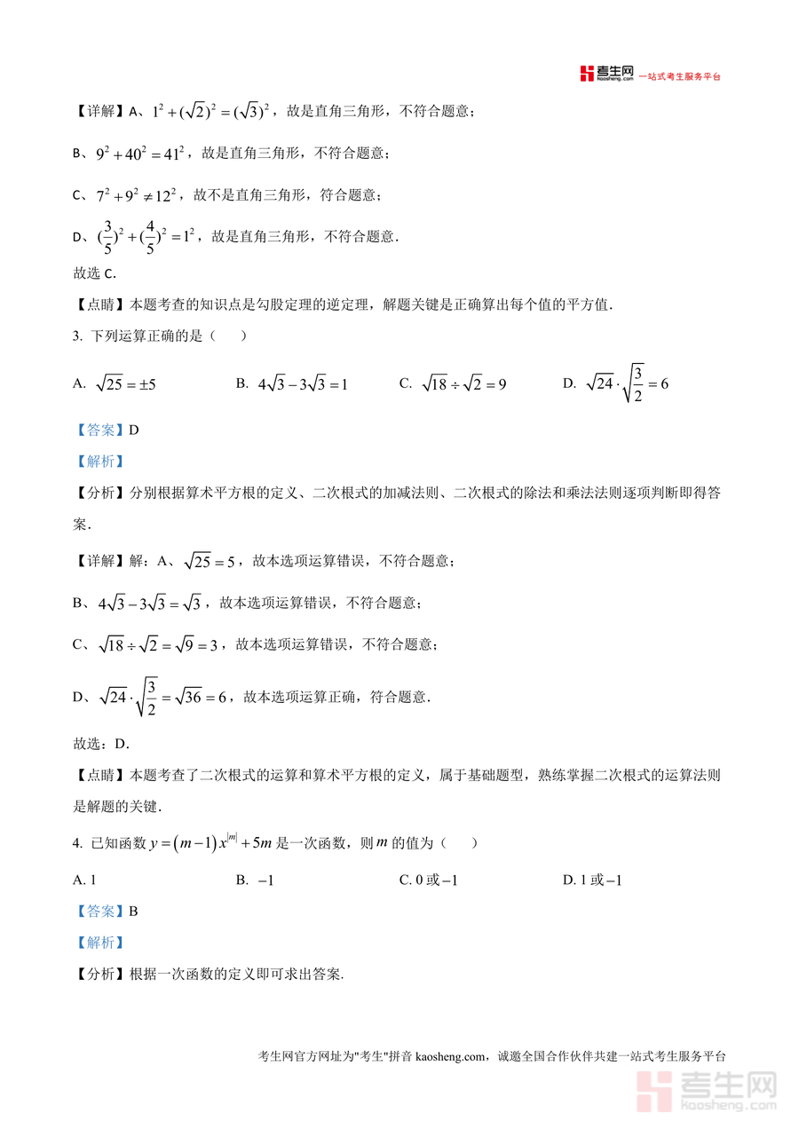 《精品解析:广东省深圳市宝安区七校联考2024-2025学年八年级上学期11月期中数学试题(解析版)》是一份针对八年级上学期期中阶段数学学习成果检测与备考提升设计的数据资料。该资料包含完整试题及逐题深度解析,覆盖实数分类与运算、勾股定理及逆定理应用、一次函数图像与性质等核心考点;每个题目均配备详细审题思路、步骤解析及易错点提示——如选择题中无理数判断依据"开方不尽数、无限不循环小数、含π数"三种形式分类讲解,折叠问题通过设未知数结合勾股定理建立方程求解,体现备考资料对知识点深度剖析与解题方法提炼特色,助力学生构建系统知识体系。