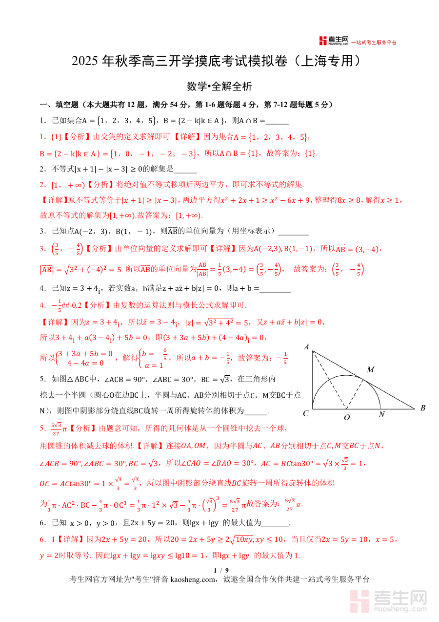 这份资料核心用途在于帮助高三学生快速定位开学初期知识掌握情况并为后续复习规划提供数据支撑教师可作开学摸底测试卷评估班级整体水平学生可自主练习自我诊断使用场景包括课堂限时测试课后自主训练针对性错题复盘用户价值体现在模拟真实考试情境提升应试能力借助详细解析弥补知识漏洞熟悉上海高考数学命题风格难度梯度备考优势方面题目设计兼顾基础拔高既巩固核心概念又训练综合应用能力通过典型例题构建解题模型提高答题效率
