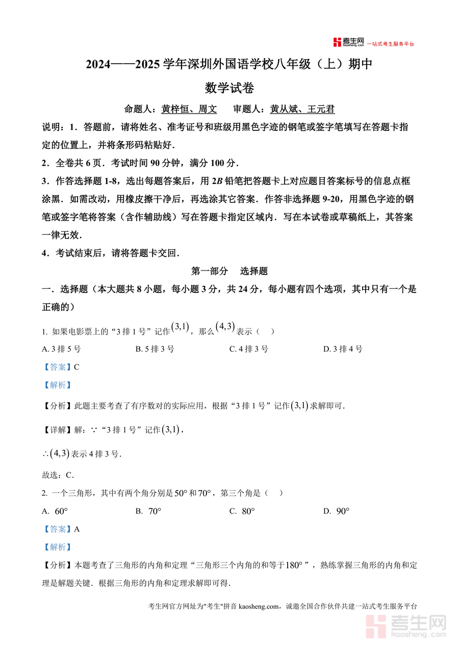 《精品解析:广东省深圳市深圳外国语学校2024—2025学年八年级上学期期中考试数学试卷 (解析版).docx》是一份聚焦深外八年级上册期中数学考试的权威备考资料,由该校命题团队(黄梓恒、周文等)原创试题及审题组(黄从斌、王元君)审核真题为核心,配套详尽解析。内容覆盖选择题(8题)、填空题(5题)、解答题(7题)三大题型,包含坐标系应用、三角形内角和定理、一次函数性质等八年级上册核心知识点;特色亮点在于每道题均配备"分析-详解-点睛"三层结构,如有序数对实际应用、三角形外角性质等考点精准拆解,同时附带规范答题指导(如答题卡填涂要求),助力学生掌握标准化流程。