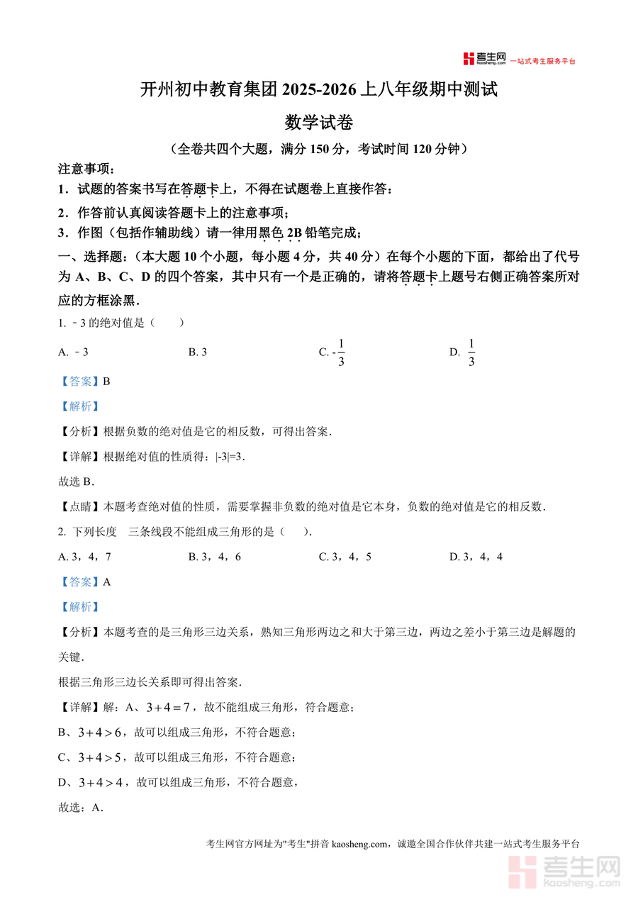 《精品解析:重庆市开州中学2025-2026学年八年级上学期11月期中数学试题(解析版)》是一份针对该中学八年级上学期期中数学考试设计真题及深度解析资料。资料包含完整试卷结构(全卷四个大题,满分150分,考试时间120分钟),覆盖选择、填空、解答等题型,每个题目均配有详细解析——不仅给出正确答案,还深入分析考点(如绝对值性质、三角形三边关系、轴对称图形识别、等腰三角形周长计算等),拆解解题步骤,标注易错点与注意事项,同时结合开州中学教学进度与本地考试特点,确保内容针对性与实用性。