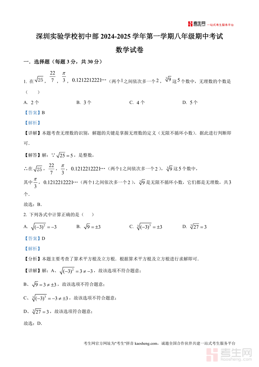 《精品解析:广东省深圳市深圳实验学校初中部2024-2025学年上学期八年级期中考试数学试卷(解析版).docx》是一份聚焦深圳实验学校八年级期中数学考试命题特点、配套详尽考点解读与解题指导的专业备考资料。文件涵盖选择题、填空题、解答题全题型内容,覆盖无理数识别、同类二次根式判定、勾股定理应用、一次函数图像变换及平面直角坐标系定位等八年级上册数学核心知识点;其特色亮点在于每道题均配备精准解析,如选择题中无理数识别题明确标注无限不循环小数定义依据并列举易错混淆项,解答题含规范解题步骤及思路拓展提示,助力学生深度理解考点本质。