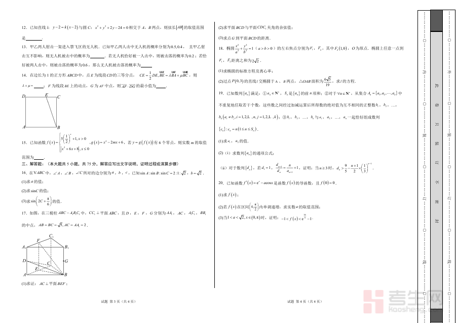 《2025年高三数学秋季开学摸底考(天津专用)(考试版A3).docx》是一份针对天津市高三学生秋季开学阶段设计的标准化摸底测试备考资料。该资料严格遵循天津高考数学命题规范与题型结构,包含第Ⅰ卷(9道选择题共45分)、第Ⅱ卷(6道填空题共30分及5道解答题共75分),考试时长120分钟,满分150分,测试范围覆盖高考全部核心知识点。其特色亮点在于深度贴合天津本地高考命题趋势,融入近年高频考点与创新题型,并采用A3排版格式,与真实考试试卷呈现形式一致,能有效模拟考场环境。