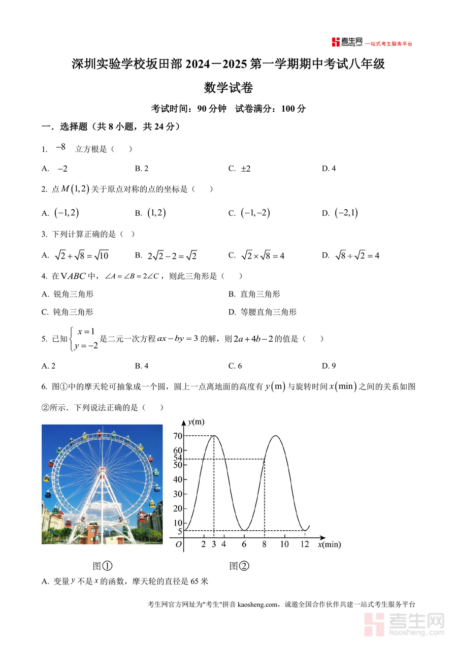 本资料适用于深圳实验学校坂田部八年级在读学生、备考深圳同类重点学校期中数学考试的学生,以及需要参考优质期中试题资源的初中数学教师。作为该校官方期中测试原卷版本,其权威性与针对性具有不可替代性,不仅能助力学生高效备考当期期中,还可作为后续复习阶段回顾核心知识点、强化解题技巧的重要资料,具有长期学习参考价值。