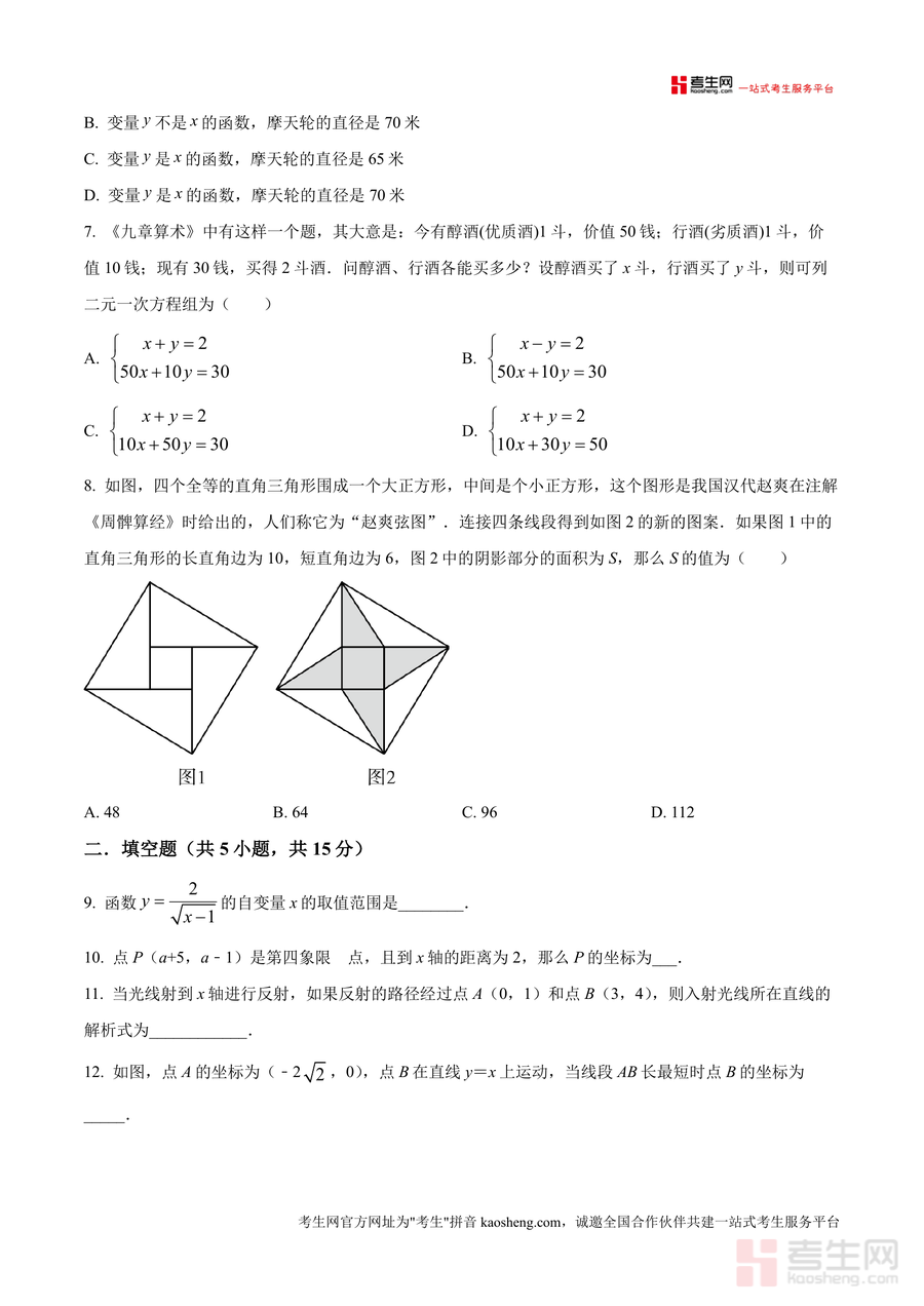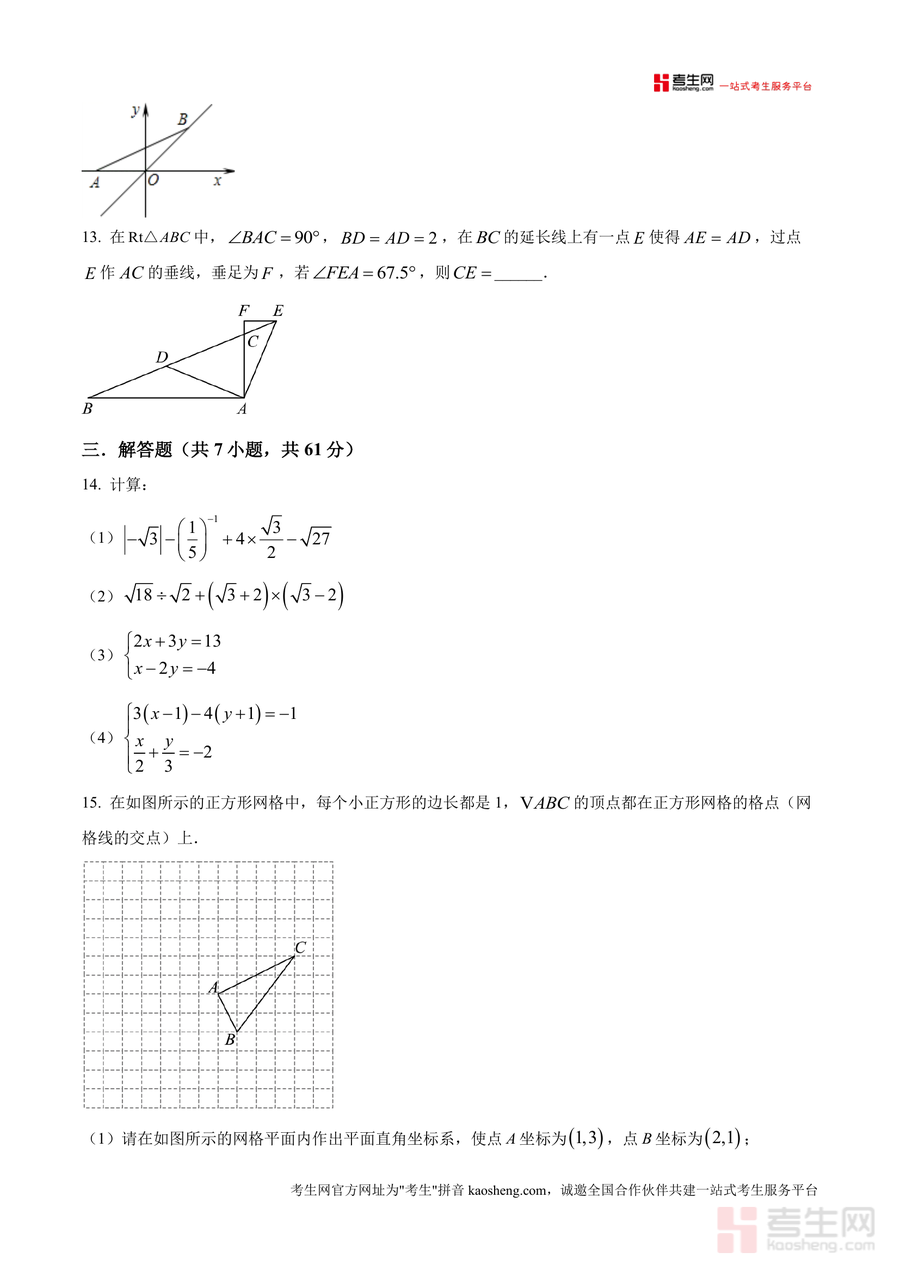 《精品解析:广东省深圳市深圳实验学校坂田部2024-2025学年八年级上学期11月期中考试数学试题(原卷版).docx》是一份精准匹配深圳实验学校坂田部八年级期中测试要求的原卷备考资料。该资料严格遵循该校教学进度与命题规范,包含选择题(8小题24分)、填空题(5小题15分)及解答题(7小题61分)三大题型结构,覆盖全等三角形性质与判定、一次函数图像分析、勾股定理应用、二元一次方程组求解等八年级上册核心知识点。其特色在于融入该校阶段性教学重点题型,如"赵爽弦图"几何计算、"公道杯"实际应用问题及矩形折叠探究等,既考查基础运算能力,又注重数学思维与实践应用能力的综合培养。