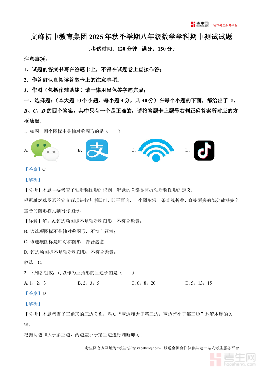 《精品解析:重庆市开州区文峰教育集团2025-2026学年八年级上学期11月期中数学试题(解析版).docx》是一份针对八年级数学期中备考设计的专业真题解析资料。文件包含完整试题及逐题详细解析,覆盖轴对称图形识别、三角形三边关系、全等三角形判定等核心考点;解析部分不仅给出正确答案,还深入剖析解题思路、考点分布及易错点,帮助学生理解知识点应用逻辑。其特色在于结合本地教育集团命题特点,题型设置贴近实际考试要求,解析注重方法总结与思维引导,为学生提供高效的学习参考依据。