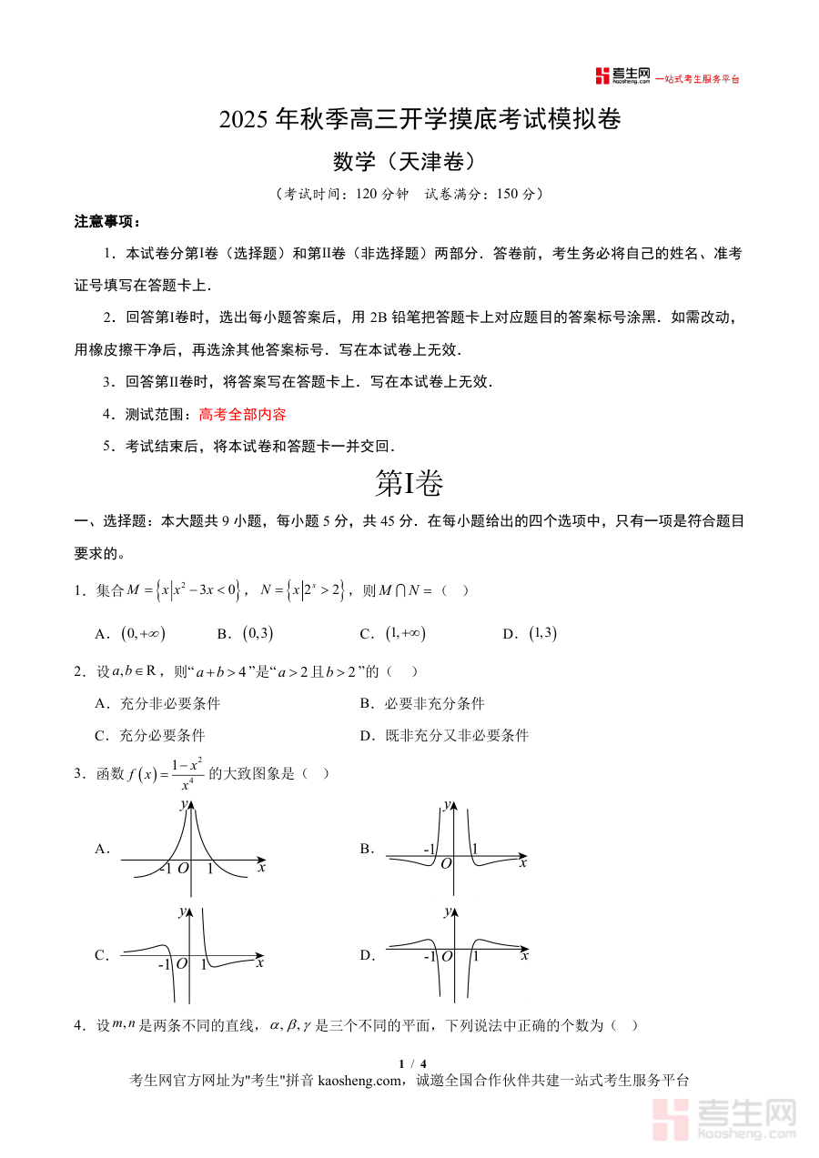 本资料适用人群为天津市高三年级学生、高中数学教师及高考辅导从业者。作为高三首轮系统复习前的关键测评工具其必要性在于能直观反映使用者对高考数学知识体系的掌握程度为后续复习规划提供数据支撑;不可替代性体现在天津专用题型与考点匹配度高区别于通用模拟卷的泛化设计;长期价值在于积累实战考试经验强化知识应用能力对高三全年复习规划具有重要指导意义是提升高考数学成绩的重要辅助资料。