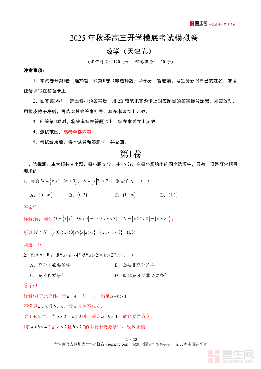 本资料适用于天津地区高三学生及高中数学教师群体。对于学生而言,它是开学摸底不可或缺的工具,能帮助快速进入高考备考状态;对于教师,它可作为教学规划与学情分析的数据参考。其不可替代性体现在针对天津卷的专属设计与专业解析,不仅满足短期摸底需求,更能长期辅助考点巩固与能力提升,是高三数学备考阶段极具价值的参考资料。