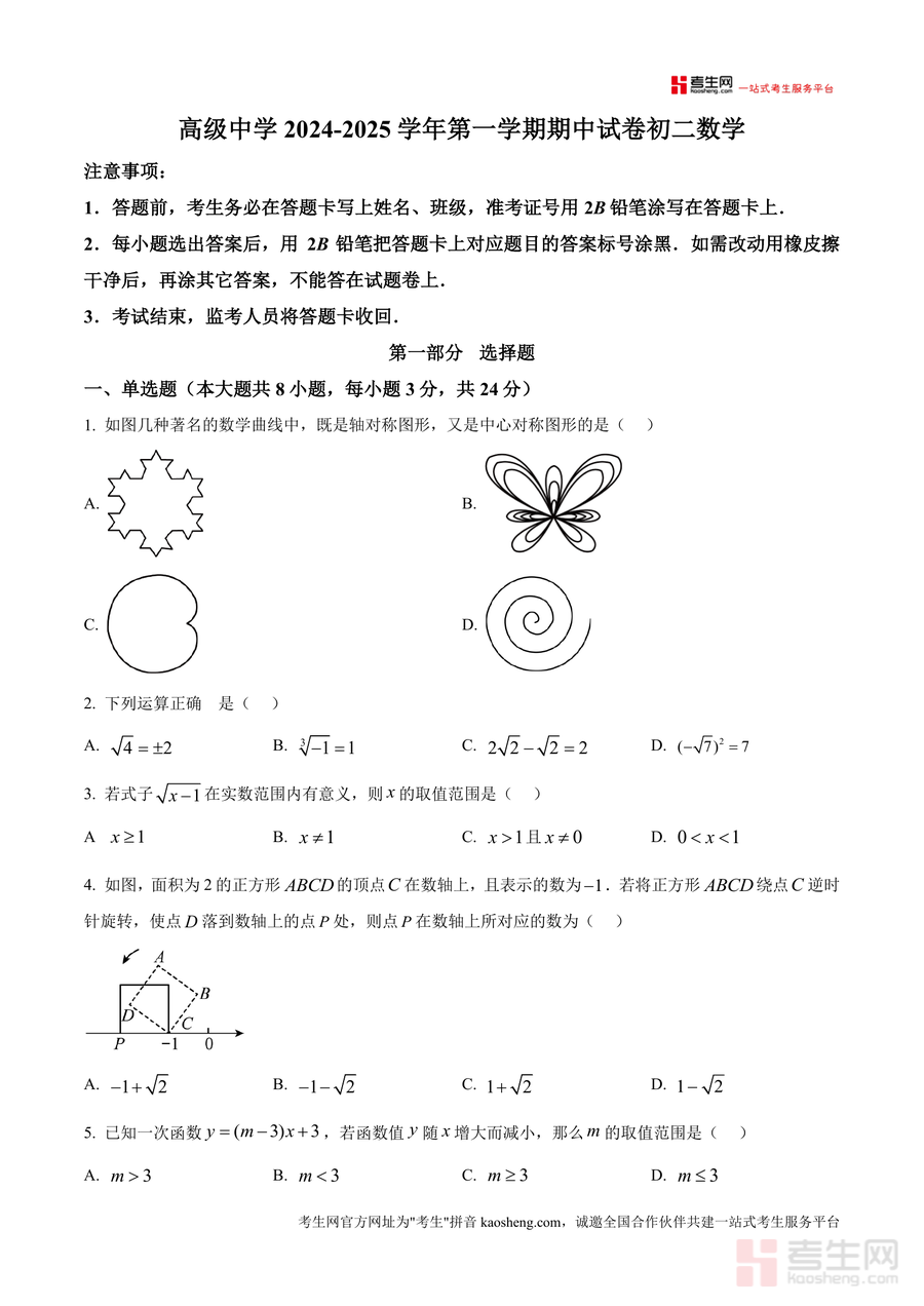 《精品解析:广东省深圳市深圳高级中学2024-2025学年上学期八年级期中考试数学试卷(原卷版).docx》是一份聚焦深圳高级中学八年级学生期中备考需求的权威真题资料。该资料完整还原了期中考试原题全貌,包含选择题(8小题,共24分)、填空题(5小题,共15分)及解答题(7小题,共61分)三大题型板块,并保留了考试注意事项、答题规范等关键细节。内容覆盖轴对称与中心对称图形判断、整式运算、函数性质应用、勾股定理实际场景求解等八年级上册数学核心知识点,是兼具真实性与针对性的优质备考资料。