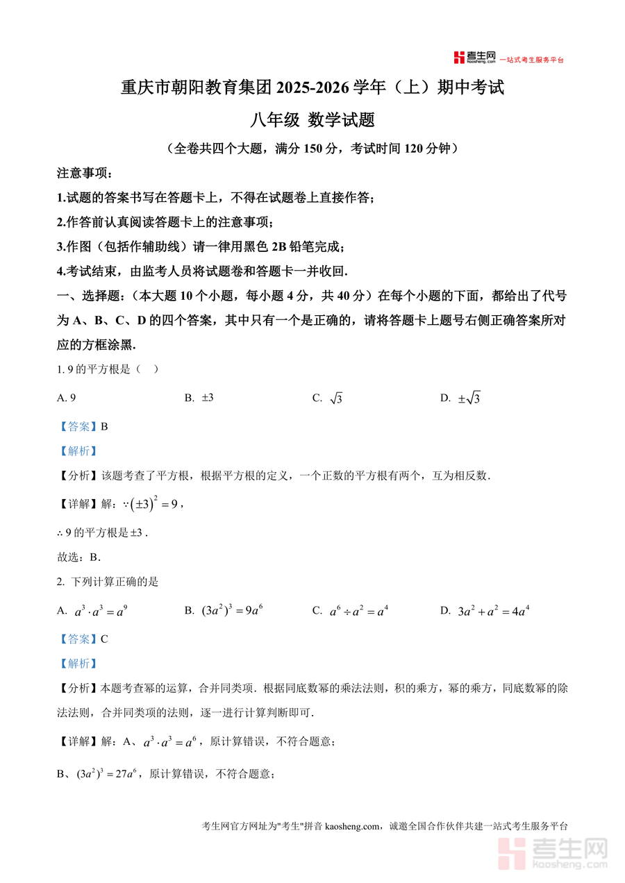 《精品解析:重庆市朝阳教育集团2025-2026学年上学期期中考试八年数学试题(解析版).docx》是一份聚焦八年级数学期中核心考点的真题解析类备考资料,包含全卷四大题(选择、填空、解答等)共150分试题及对应详细解析。内容覆盖平方根运算、幂运算、三角形全等判定、命题真假判断等八年级上册核心模块;特色亮点在于每道题配备考点定位、分步解题过程及易错点警示——如选择题中幂运算题明确法则应用误区,填空题杨辉三角题型结合规律推导,解答题展示规范步骤,助力学生精准掌握方法。