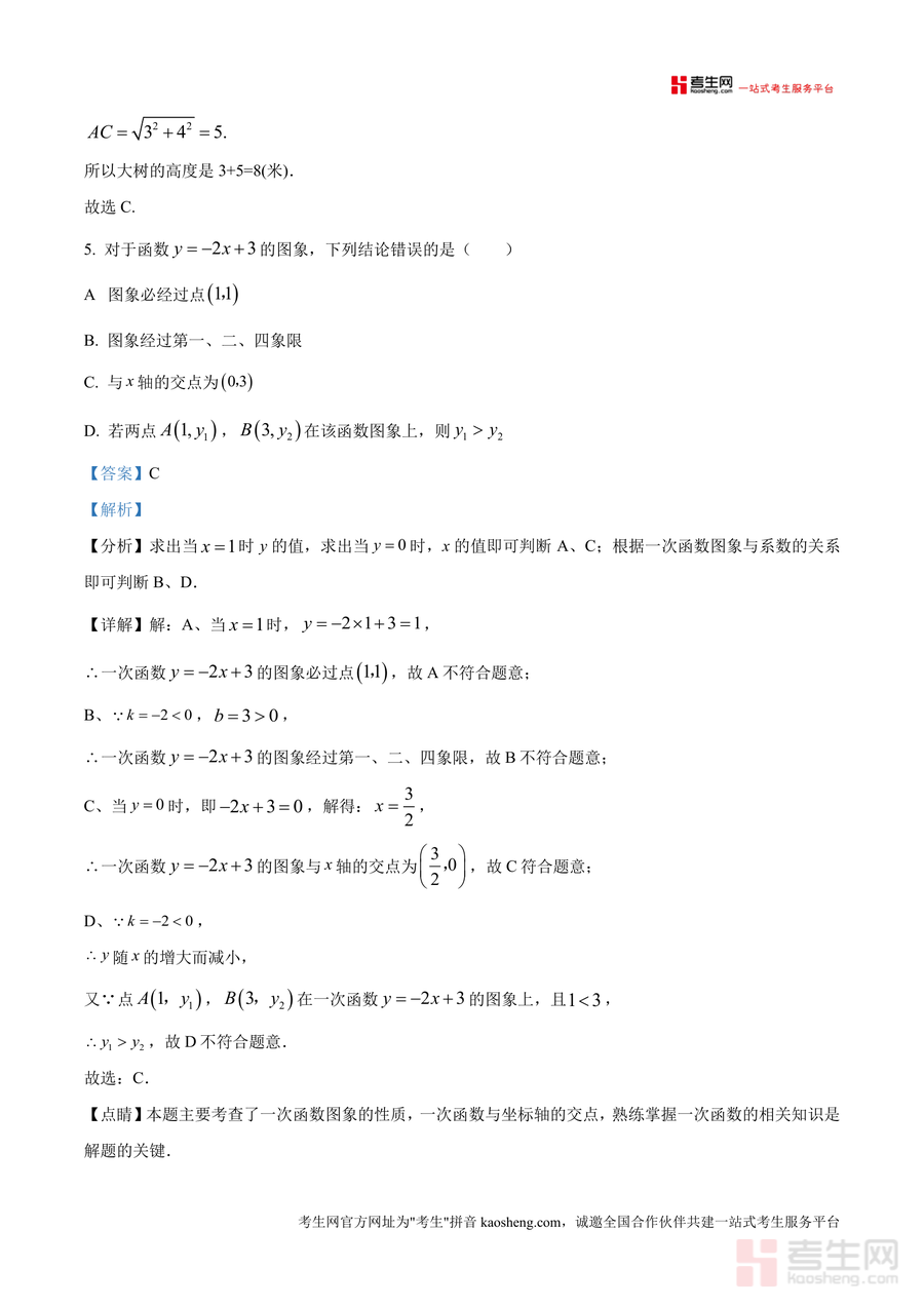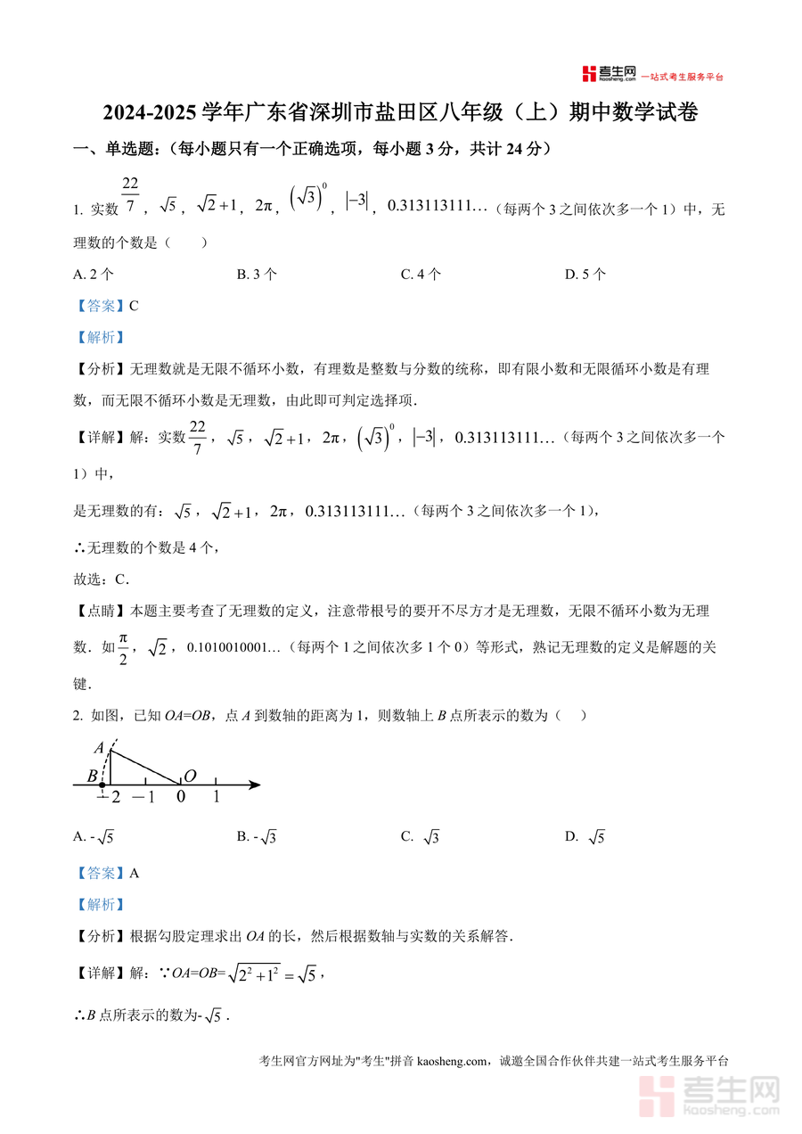 《精品解析:广东省深圳市盐田区2024-2025学年八年级上学期期中考试数学试卷(解析版).docx》是一份针对盐田区八年级学生期中数学备考设计 的专业真题解析资料,涵盖试卷全部题型(单选题8道、填空题5道、解答题7道)及完整解答过程。内容聚焦八年级上册核心知识点,包括无理数判断、勾股定理应用、一次函数图像分析与计算、几何图形折叠与展开等,每个题目均配备"分析""详解""点睛"模块:分析部分明确考点与解题思路,详解部分展示规范步骤与计算过程,点睛部分总结易错点与方法技巧,帮助学生深度理解知识本质及应用逻辑。