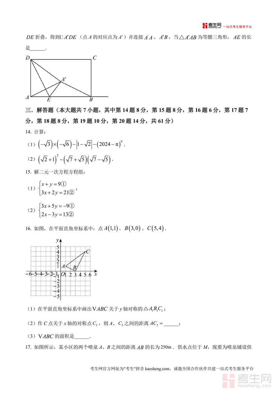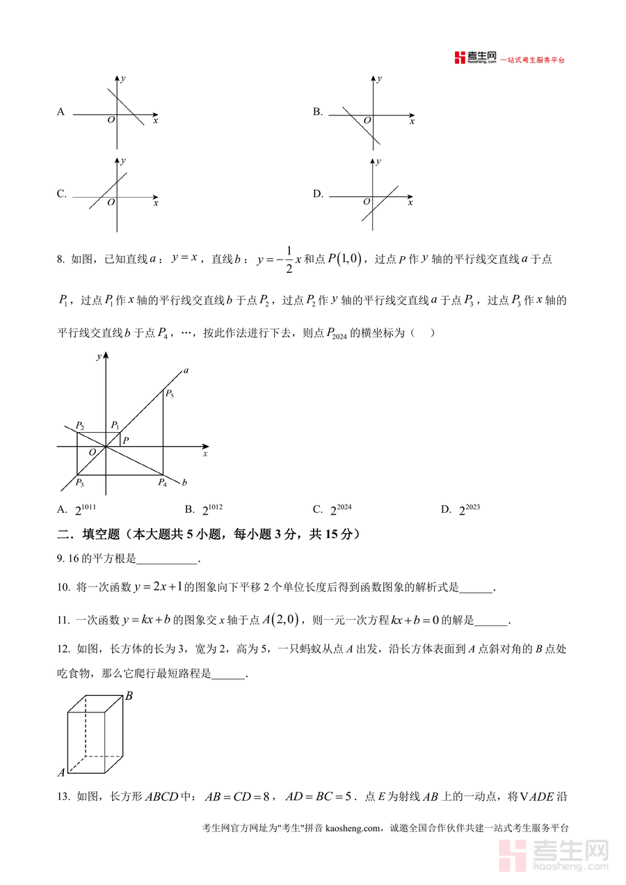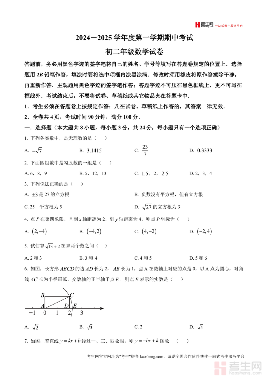 《精品解析:广东省深圳市福田区外国语学校(集团)2024-2025学年八年级上学期11月期中考试数学试题(原卷版).docx》是一份聚焦深圳本地名校期中数学考试需求的优质备考资料。该试题严格遵循八年级上学期数学教学大纲与福田区外国语学校集团教学进度设计,包含选择题(8小题共24分)、填空题(5小题共15分)、解答题(7小题共61分)三大题型结构,总分100分,考试时长90分钟。内容覆盖无理数识别、勾股数判定、一次函数图像变换与应用、平面直角坐标系对称操作等核心考点,并附带详细答题规范提示(如填涂要求、作答区域限制等),完整还原真实考试场景。