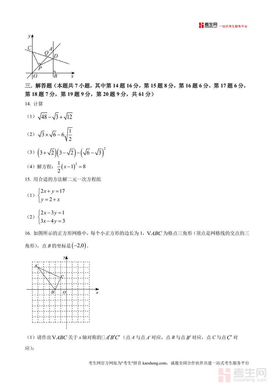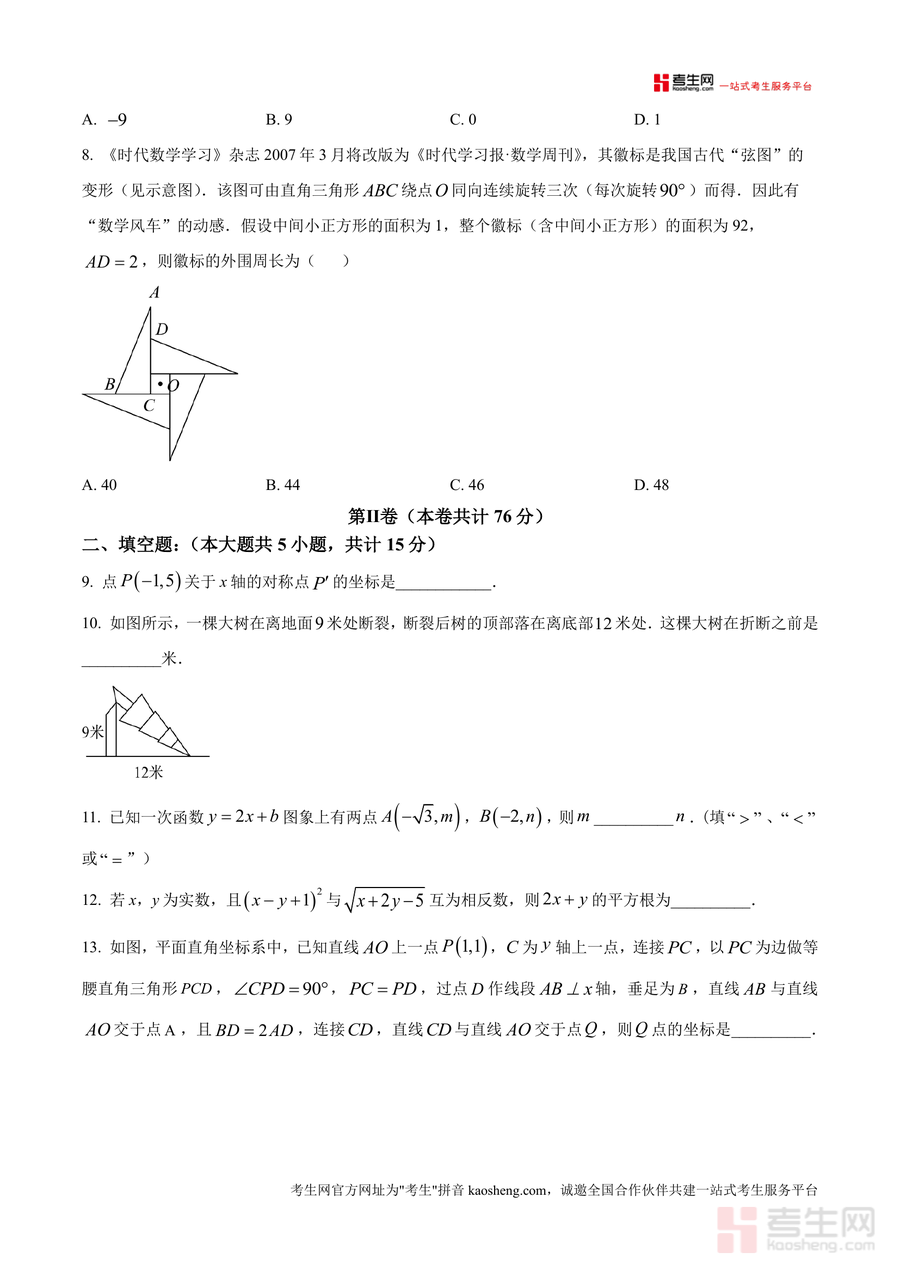 《精品解析:广东省深圳市福田区实验教育集团侨香学校2024-2025学年八年级上学期期中考试数学试卷(原卷版)docx》是一份聚焦深圳福田区侨香学校初二学生期中备考需求的权威真题原卷资料,完整呈现该校期中数学检测的题型结构与考点分布。文件严格遵循本地期中考试规范设计——满分100分、考试时长90分钟;题型分为第Ⅰ卷(24分选择题,含无理数判断、直角三角形三边验证等基础考点)与第Ⅱ卷(76分非选择题,含填空及解答题,覆盖函数图象分析、二元一次方程组求解、几何图形计算等综合题型),精准反映该校教学重点与命题风格,为学生提供贴合实际考试的训练载体。
