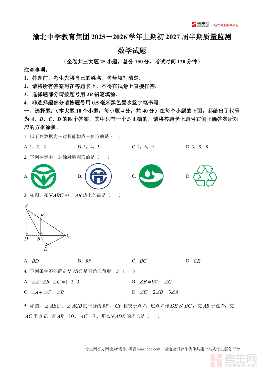 《精品解析:重庆市渝北中学校2025-2026学年八年级上学期期中考试数学试题(原卷版)》是一份精准对接渝北中学教育集团初2027届半期质量监测要求的权威真题资料。该资料包含全卷三大题25小题(选择题10道40分、填空题6道24分、解答题9道86分),总分150分,考试时间120分钟,严格遵循校考答题规范(如姓名考号填写要求、答题卡填涂说明等)。内容覆盖全等三角形判定与性质、轴对称图形识别、三角形内角和与外角性质、垂直平分线应用等八年级上册数学核心知识点,贴合学校教学进度与命题风格。