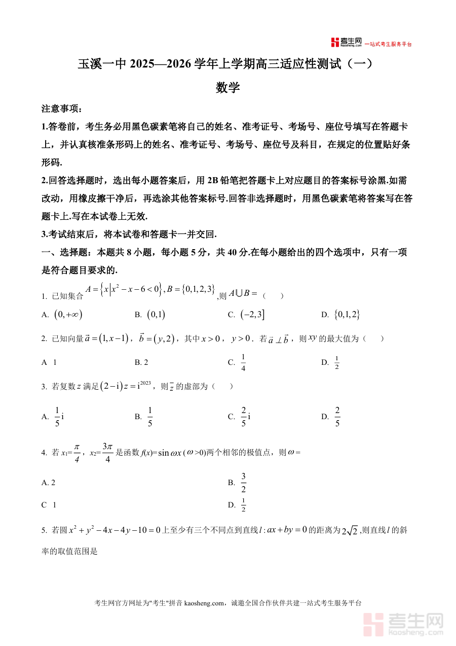 《精品解析:云南省玉溪第一中学2025-2026学年高三上学期适应性测试(一)数学试题(原卷版).docx》是一份面向高三学生数学备考阶段设计的高质量适应性测试真题资料。该资料完整呈现了玉溪一中高三首次适应性测试数学科目的原卷内容,包含选择题(8道单选题+3道多选题)、填空题(3道)及解答题(5道)三大题型模块,覆盖集合运算、向量性质、复数运算、三角函数极值、立体几何动点问题、解析几何椭圆综合、概率统计分层抽样等高考核心考点。其特色在于严格遵循新高考数学题型结构要求,融入多选题等创新题型,并结合云南本地教学实际与高考考情,试题难度梯度合理、考点分布均衡,能有效模拟高考真实考试场景。