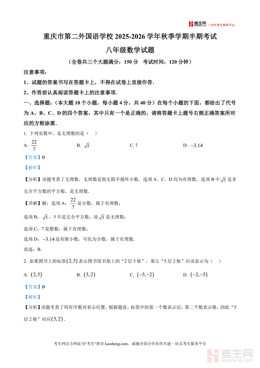 《精品解析:重庆市第二外国语学校2025-2026学年上学期期中考试数学试卷(解析版).docx》是一份聚焦八年级数学期中考试核心考点与命题规律的专业化真题解析资料。文件涵盖完整试卷原题及三大题型(选择题10道、填空题6道、解答题9道)深度解析内容——每道题均包含考点定位(如无理数概念、勾股数判定、一次函数图像性质等)、详细解题步骤、易错点警示及同类题型方法总结;解析过程严格遵循数学逻辑,结合教材知识点与考试要求展开,并融入该校教学特色与命题倾向,确保内容专业且贴合实际需求。