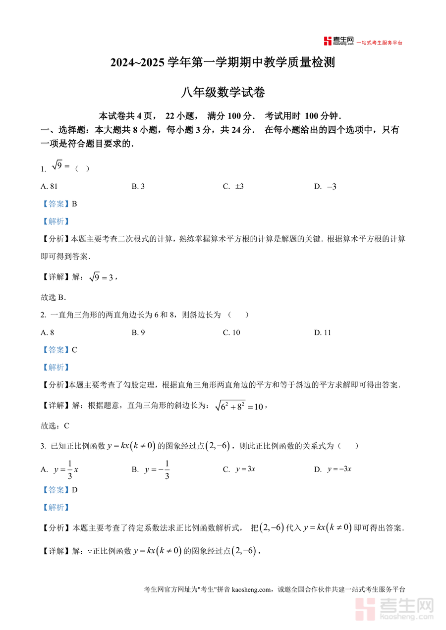 《精品解析:广东省深圳市龙华区新华中学教育集团2024-2025学年上学期八年级期中考试数学试卷(解析版)》是一份针对深圳龙华区八年级学生期中数学备考设计权威真题解析资料。该资料包含完整试卷结构与详细解析,试卷共4页22小题满分100分,分选择(8题24分)、填空(5题15分)、解答(7题61分)三大题型;解析部分针对每道题提供考点定位(如二次根式计算、勾股定理、一次函数解析式)、详细解题步骤及易错点提示,部分难题(如第8题旋转辅助线构造)还配有思路拓展,帮助学生理解核心方法。