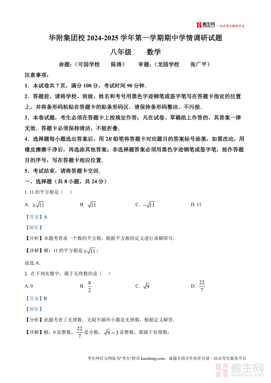 《精品解析:广东省深圳市龙岗区华附集团校2024-2025学年上学期八年级期中考试数学试卷(解析版).docx》是一份针对该集团校八年级期中数学考试设计专业备考资料与真题解析文件。包含完整试卷原题及逐题详细解析,命题团队由可园学校陈涛老师命题、龙园学校张广平老师审题,确保内容贴合集团校教学进度与考纲要求;解析部分涵盖题目考点分析、步骤详解、易错点提醒及解题技巧总结,如选择题中勾股定理逆定理应用示例、填空题中平面直角坐标系对称点规律等,帮助使用者深入理解知识点。
